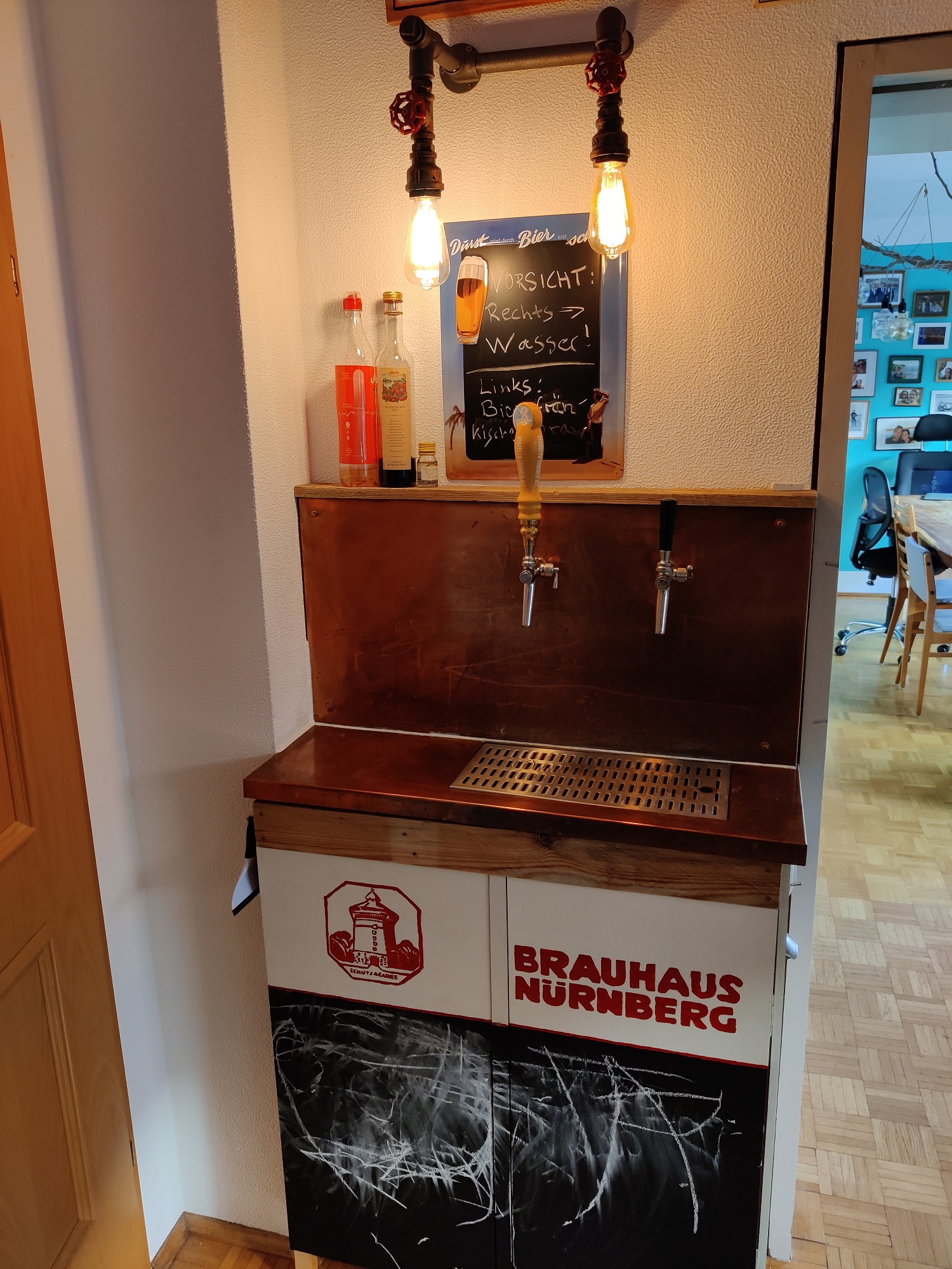 Die Zapfanlage im Wohnbereich. Kupfer würde ich nicht mehr nehmen, das putzt und poliert man und es schaut einen Moment später wieder dreckig aus... Gezapft wird mit ganz normalen Edelstahl-Kompensatorhähnen.