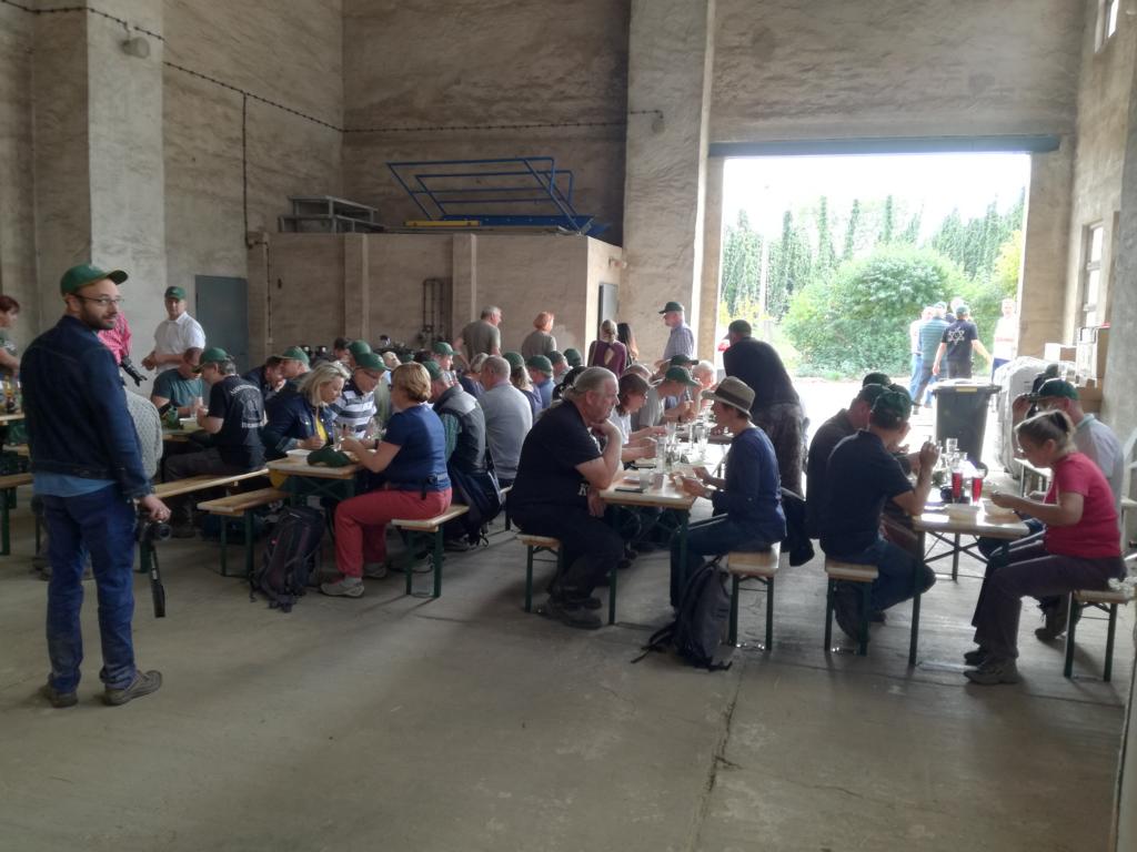 Zur Mittagspause gab es einen Imbiss in der Absack/Lagerhalle. Wahlweise Gulaschsuppe und Bockwurst. Dazu auch, wer wollte, Kaffee und alkoholfreie Getränke. In der großen Halle wurde gleichzeitig abgesackt und es lag ein betäubender Hopfenduft über allem..sehr angenehm.