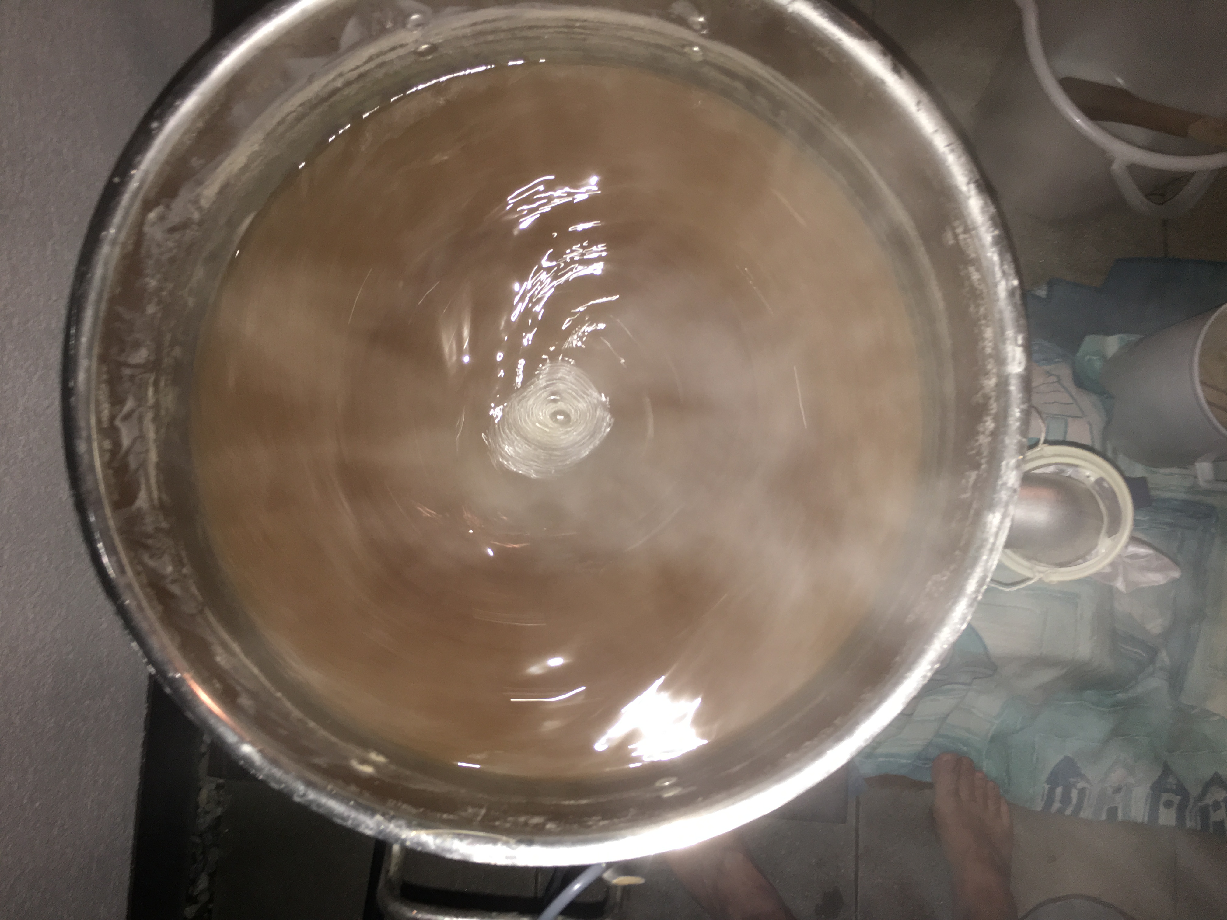 Aber nach 10 Litern wird es deutlich heller und dann kanns auch schon los gehen… Leider musste ich, da mein Glühweintopf noch bei meinen Eltern steht den Haupttopf direkt noch mal nehmen aber dank Hendi war das kein Problem…nur die letzten 6 Liter der 23l Nachguss mussten dann direkt drauf, da mir die Behälter ausgegangen sind…was auch ne Folge des fehlenden Topfs ist…