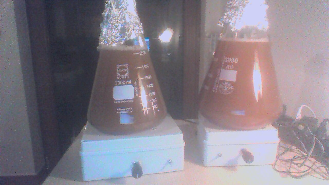 In der Zwischenzeit hatte ich weitere 4 Liter Würze im 2l und 3l Erlenmeyerkolben zubereitet. um 19:00 habe ich dann den 1l-Starter in sehr aktivem Zustand zu dem neuen Starter hinzugegeben (entsprechend aufgeteild 400ml auf 1,6l und 600ml auf 2,4l. Das ganze sieht jetzt so aus: