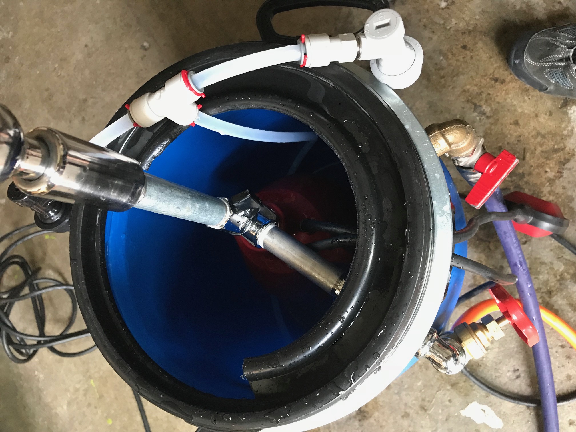 Das Fass hat zwei Löcher bekommen, je eins für das Kabel und eine Schnur um den Schwimmer hochziehen zu können: