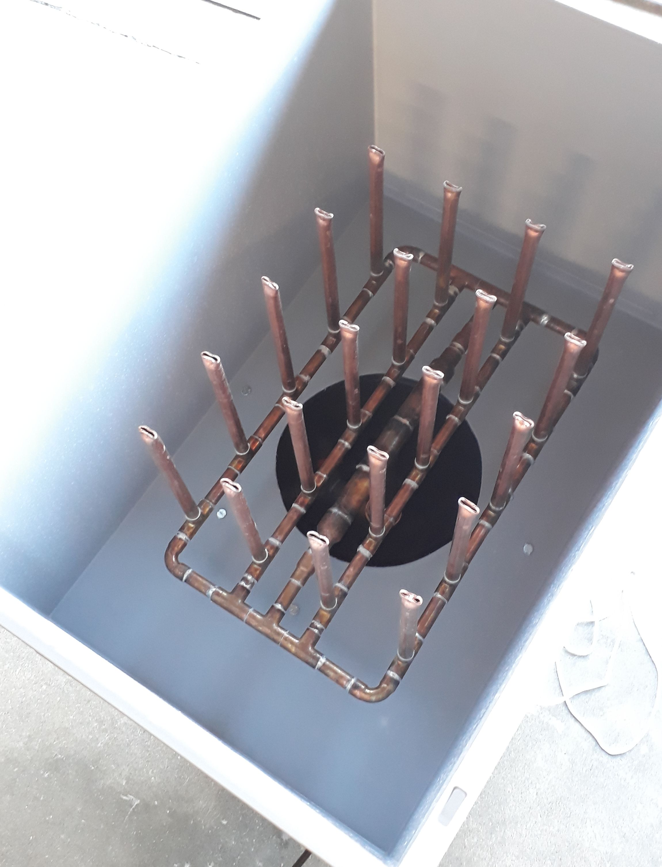 Damit ich nicht nur Fässer sondern auch Flaschen waschen kann habe ich mir noch ein Flaschenwaschgeweih gebaut. Das passt wunderbar in die Kiste rein: