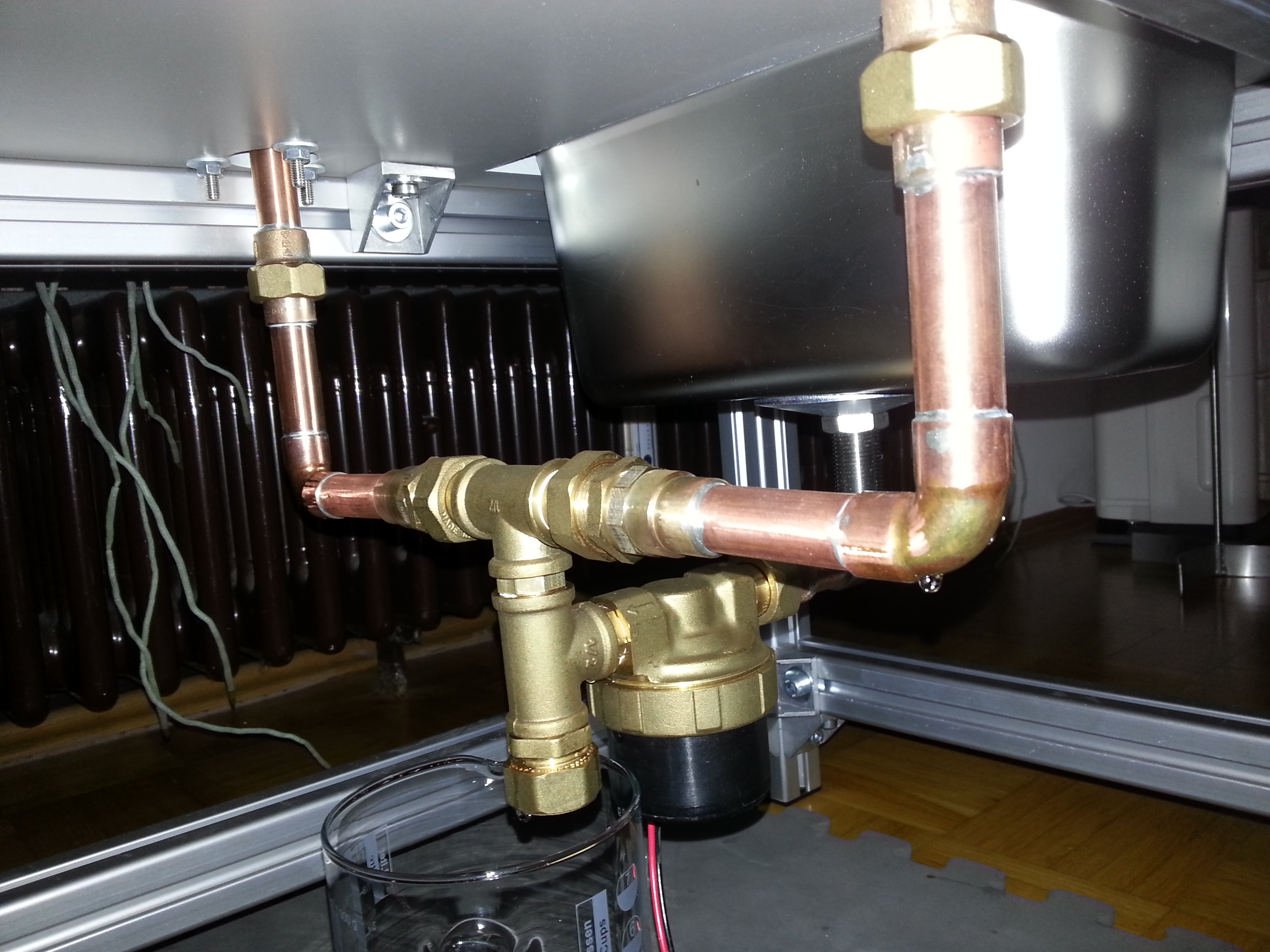 Die Pumpe und die Leitungen habe ich die letzten Tage montiert und gestern einen ersten Test mit Wasser gemacht. Alles funktioniert wunderbar und man kann mit den beiden Kugelhähnen steuern, was wie schnell und wohin gepumpt werden soll. Es gibt einzig das Problem, dass die Verrohrung auf der Unterseite mit der Pumpe an vielen Stellen nach einiger Zeit das Tropfen beginnt. Das Löten beherrsche ich mittlerweile sehr gut aber Rohrverschraubungen mit Teflonband abdichten scheint nicht meine Kernkompetenz zu sein - wer hier noch einen Tipp hat....