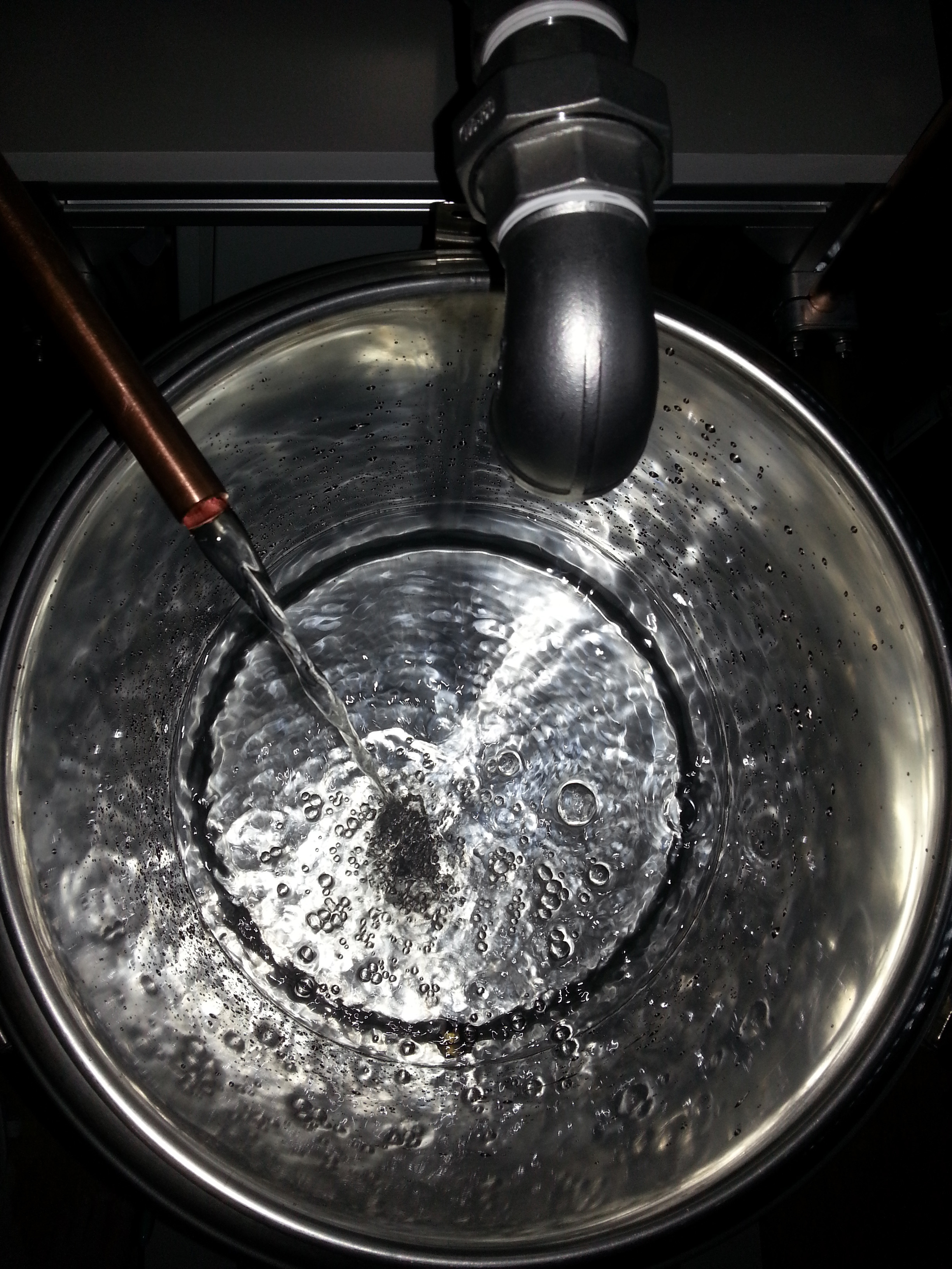 3. Zum Anschwenzen pumpe ich den Läutergrant leer, schalte auf eine zweite Kupferrohrleitung um, die in den Läuterbottich führt, lasse vom Heisswasserbereiter das Anschwenzwasser in den Läutergrant laufen und pumpe nun von dort aus in den Läuterbottich