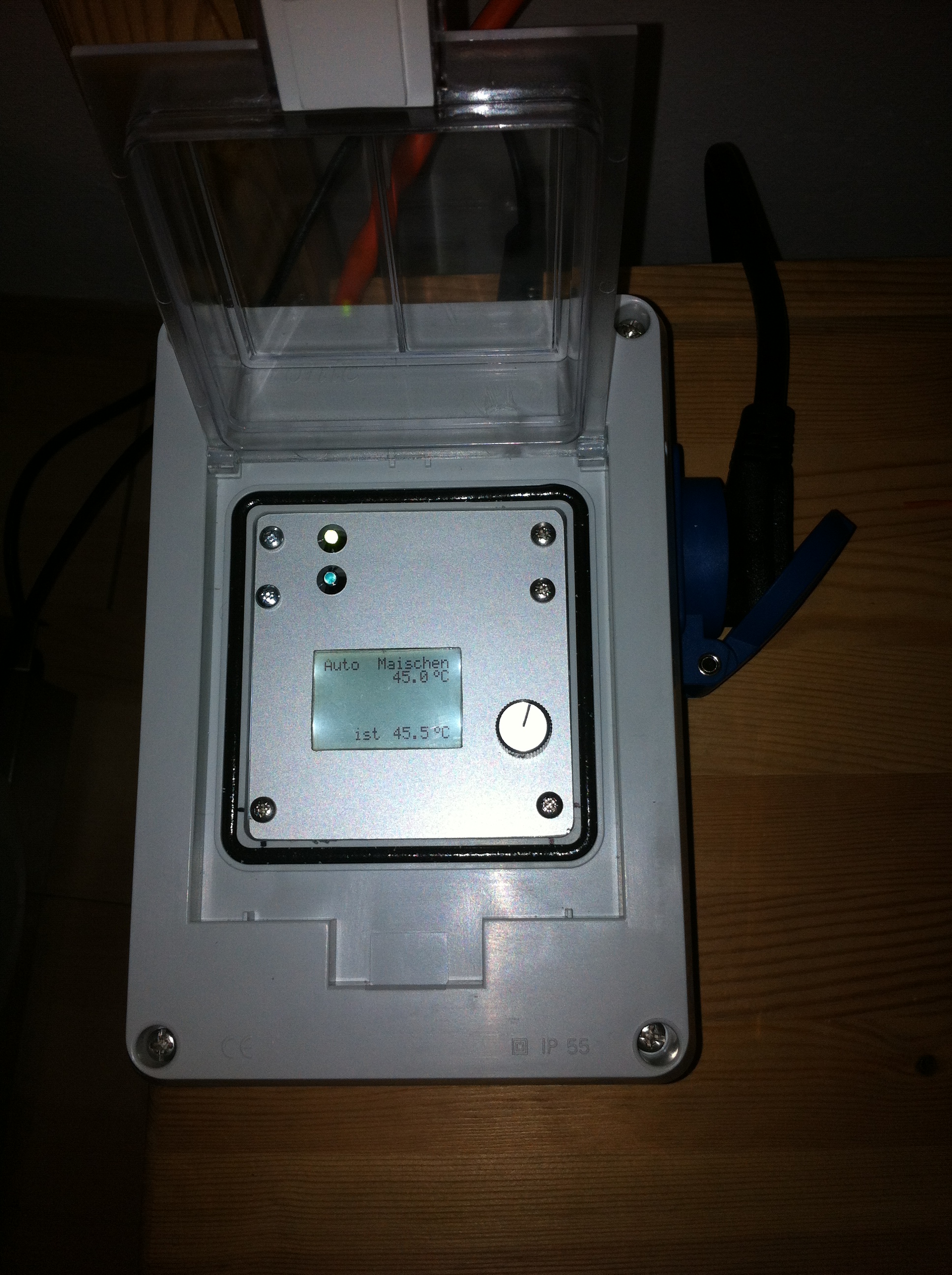 Die eigentlich Steuerung ist die "All-in-one Arduino Brausteuerung" aus dem alten Forum ( http://hobbybrauer.de/modules.php?name= ... #pid234645), ergänzt um zwei Temp. Regler, da ich bei Planungsbeginn noch zwei Töpfe für den Nachguss hatte, Schalter für die Pumpen mit Potis für die Flussmengenregulierung, die 230V Steckdose, 12V für das Rührwerk der Experimentieranalage, das Rühwerk, Voltanzeige für die Würzepumpe, Buchsen für 12V und regulierte Spannung, 230V Steckdose und diverse Status LED´s. Blick in die Steuerung: