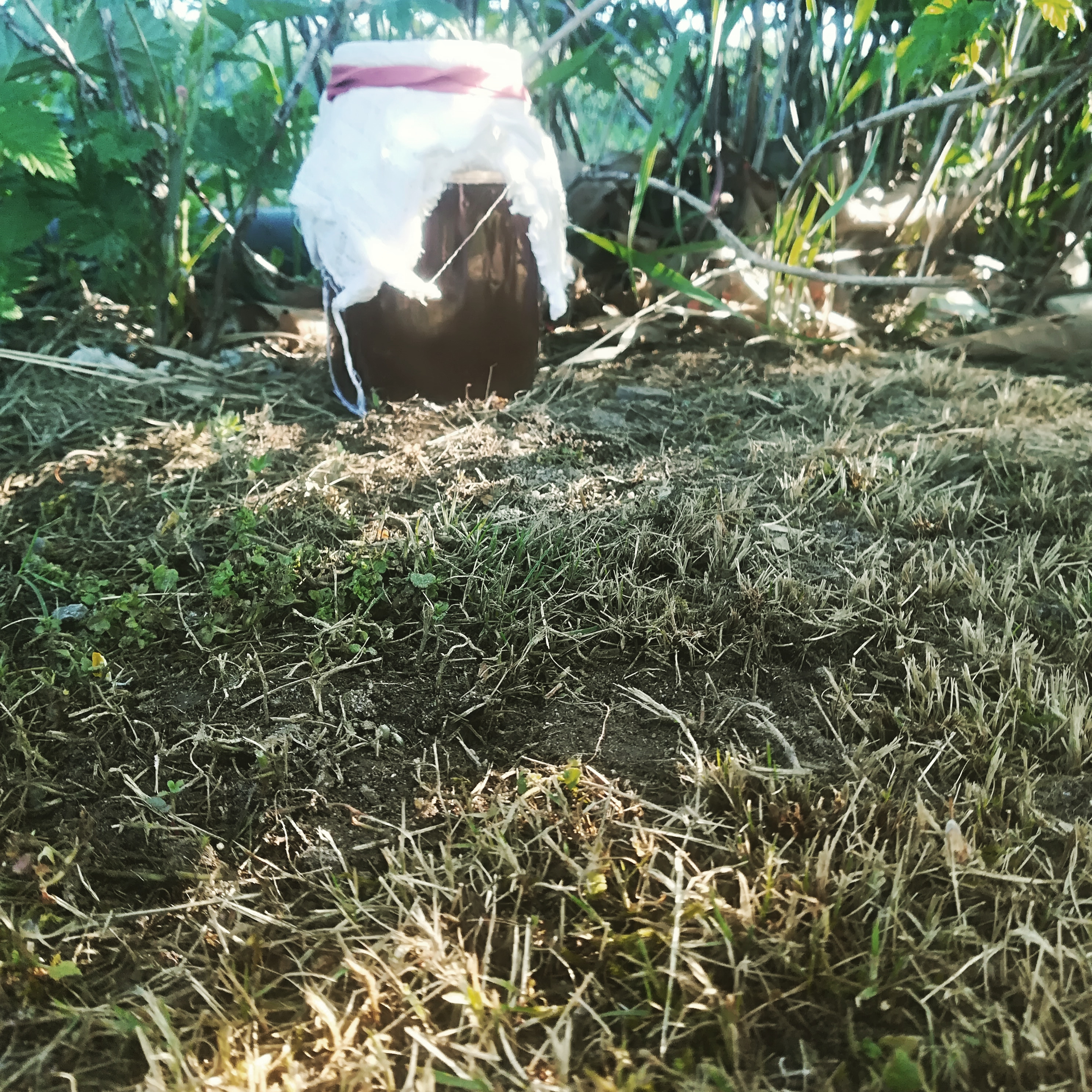 8°P Wuerze mit DME hergestellt und mit Milchsäure auf ph 4,5 eingestellt. Wuerze auf 4 Mason Jars aufgeteilt. Stoffwindel abgekocht mit Haushaltsgummi fixiert und damit die Gläser verschlossen (siehe Bild oben). Gläser unter unterschiedliche Bäume bzw. Sträucher fuer eine Nacht gestellt.