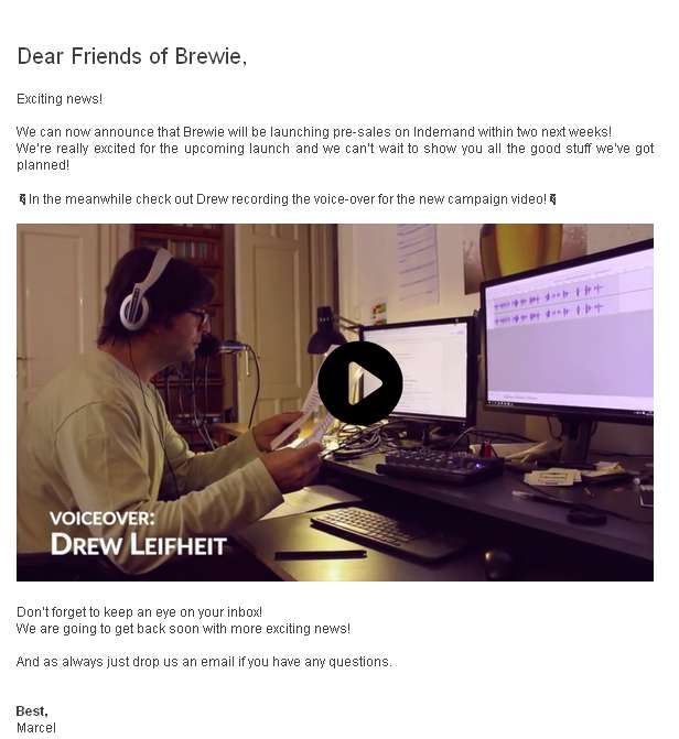 Ich übersetze das mal, was Mark da auf Englisch schreibt: "Wenn Du einen Brewie bestellen willst, musst Du diesen gleich bei der Bestellung über Indiegogo (vollständig) zahlen. Beim Crowdfunding gibt es keine Garantie, dass Du das Produkt bekommst, dass Du bestellt hast, es ist wie ein Investition. Wir wissen, dass wir neu auf dem Markt sind, aber mit unserer revolutionären Maschine haben wir einen langangelegten Werdegang vor uns. Im letzten Jahr haben wir sehr hart daran gearbeitet Brewie für jedermann leistbar zu machen. Wir bitte um jedermanns Vertrauen. Die Entwicklung von Brewie ist gerade eben zu Ende gegangen, so dass es uns nun nur noch übrig bleibt ihn zu produzieren. Wir haben jetzt noch keine Kundenhotline und wir haben noch eine menge Dinge zu tun aufgrund unserer Einführung am Mittwoch, deswegen bevorzugen wir email.