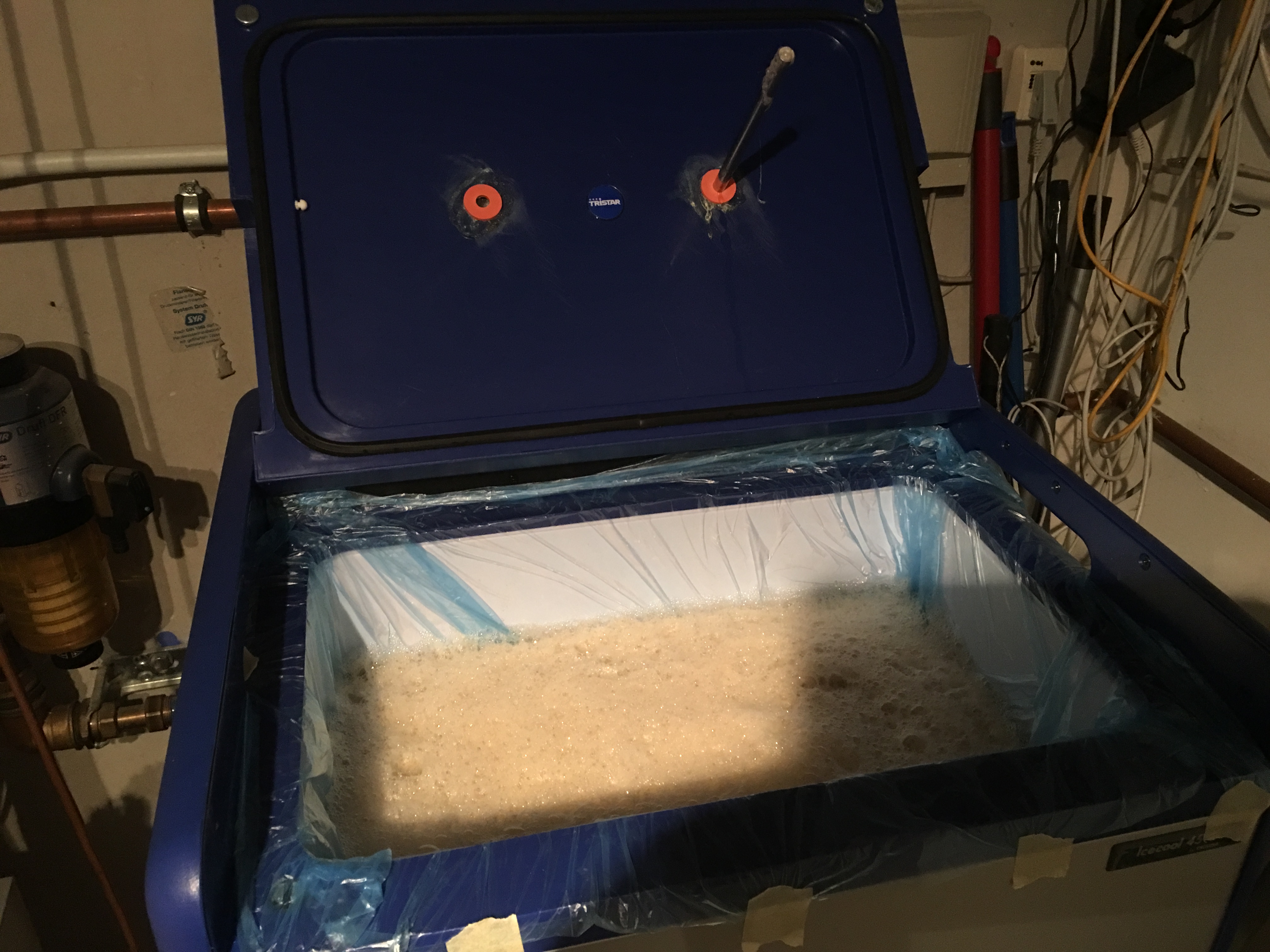 Dann werde ich für diesen untergärigen Sud zum ersten mal meine Gärkühlbox benutzen und diese muss auch vorbereitet werden... den Lebensmittel echten Plastiksack habe ich in Starsan eingelegt und mit diesem wird die Kühlbox jetzt ausgekleidet...leider konnte ich nicht herausfinden ob die Kühlbox "lebensmittelecht ist" also blieb nur diese Lösung ...