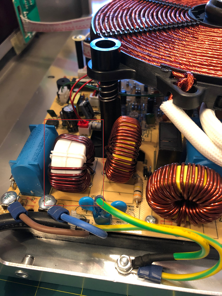 die Spulen im Vordergrund gehören wahrscheinlich zum Netzfilter, dort werden hochfrequente Einkopplungen in die Spannungsversorgung herausgefiltert. Die Spulen liegen dabei in Reihe zum Verbraucher, können also keinen Kurzschluss verursachen! Zum Filternetzwerk gehören aber auch Kondensatoren, die wiederum liegen parallel zur Spannungsversorgung. Ein defekter Kondensator kann sehr wohl einen Kurzschluss verursachen.