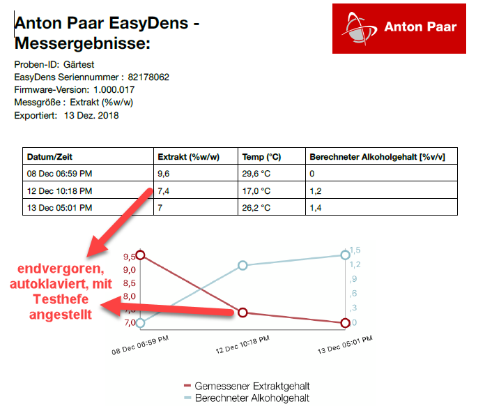 Die 10°P Maltodextrin-Würze ist angesetzt und mit frischer W34/70 angestellt. Von der W34/70 habe ich etwas unvergorene Starterwürze mit rüber genommen, damit die Zellen noch ein paar Nährstoffe in der aeroben Phase finden. Das Fläschen steht jetzt auf dem Magnetrührer und gärt sicher recht schnell zu ende.