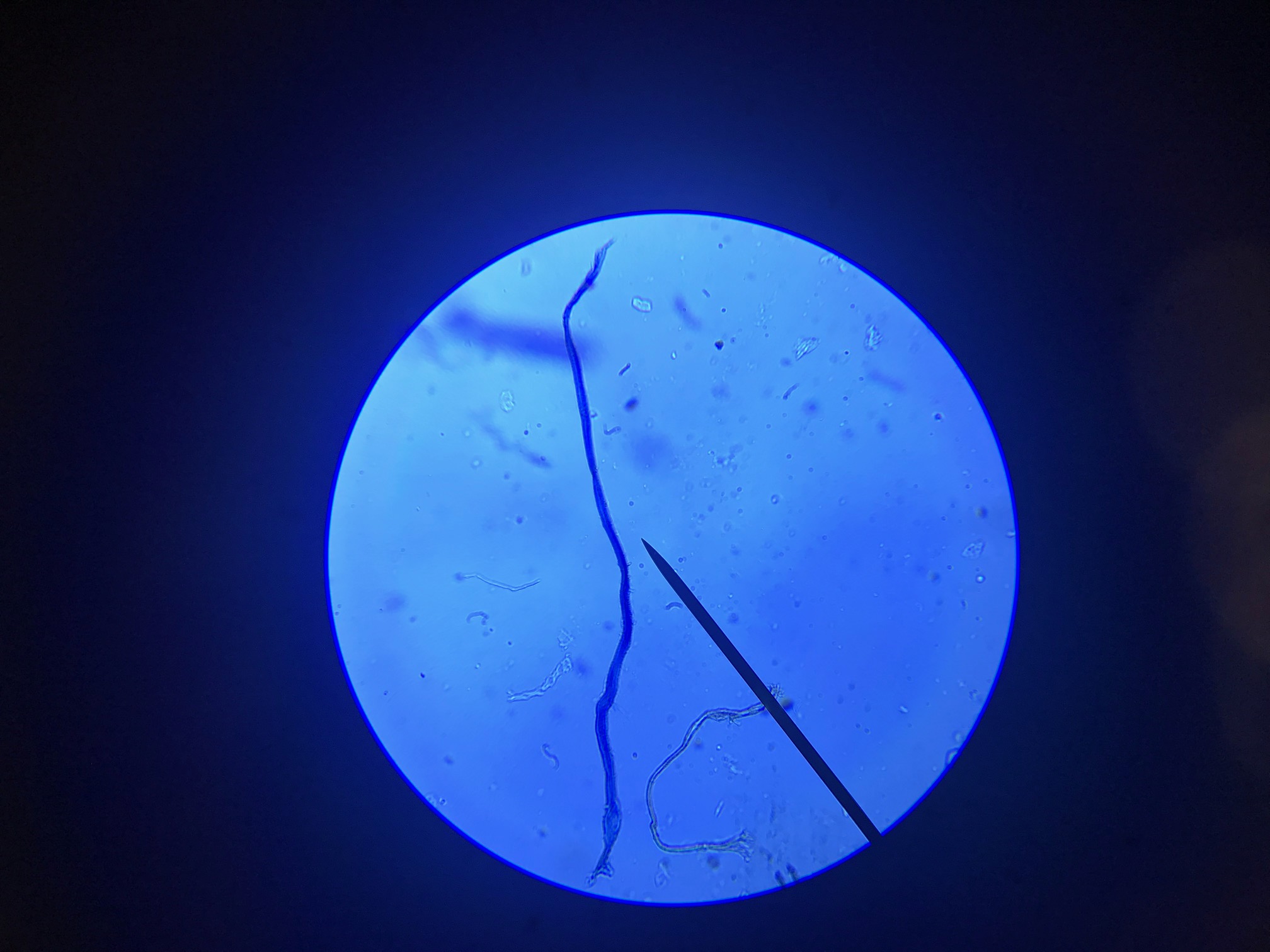 Schnell nochmal unters Mikroskop. Hefezellen sind sehr viele zu finden (leider kein Foto gemacht). Bakterien sind keine zu sehen (abgesehen von den Biestern im "Okulardreck", die immer da sind, an der gleichen Stelle).