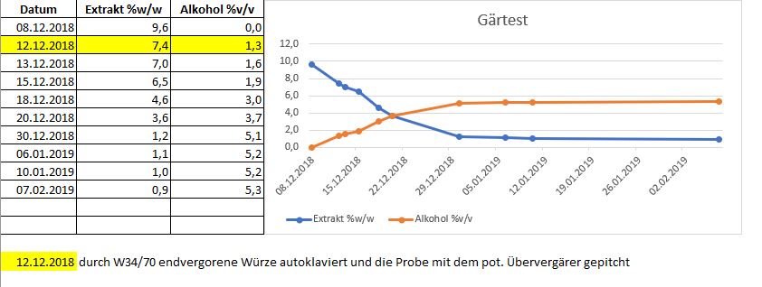 Die 10°P Maltodextrin-Würze ist angesetzt und mit frischer W34/70 angestellt. Von der W34/70 habe ich etwas unvergorene Starterwürze mit rüber genommen, damit die Zellen noch ein paar Nährstoffe in der aeroben Phase finden. Das Fläschen steht jetzt auf dem Magnetrührer und gärt sicher recht schnell zu ende.