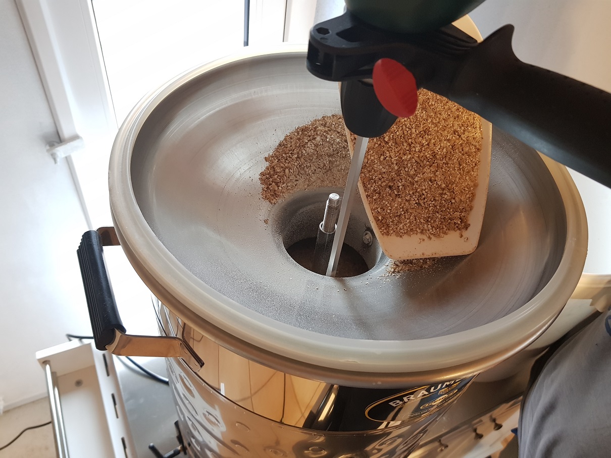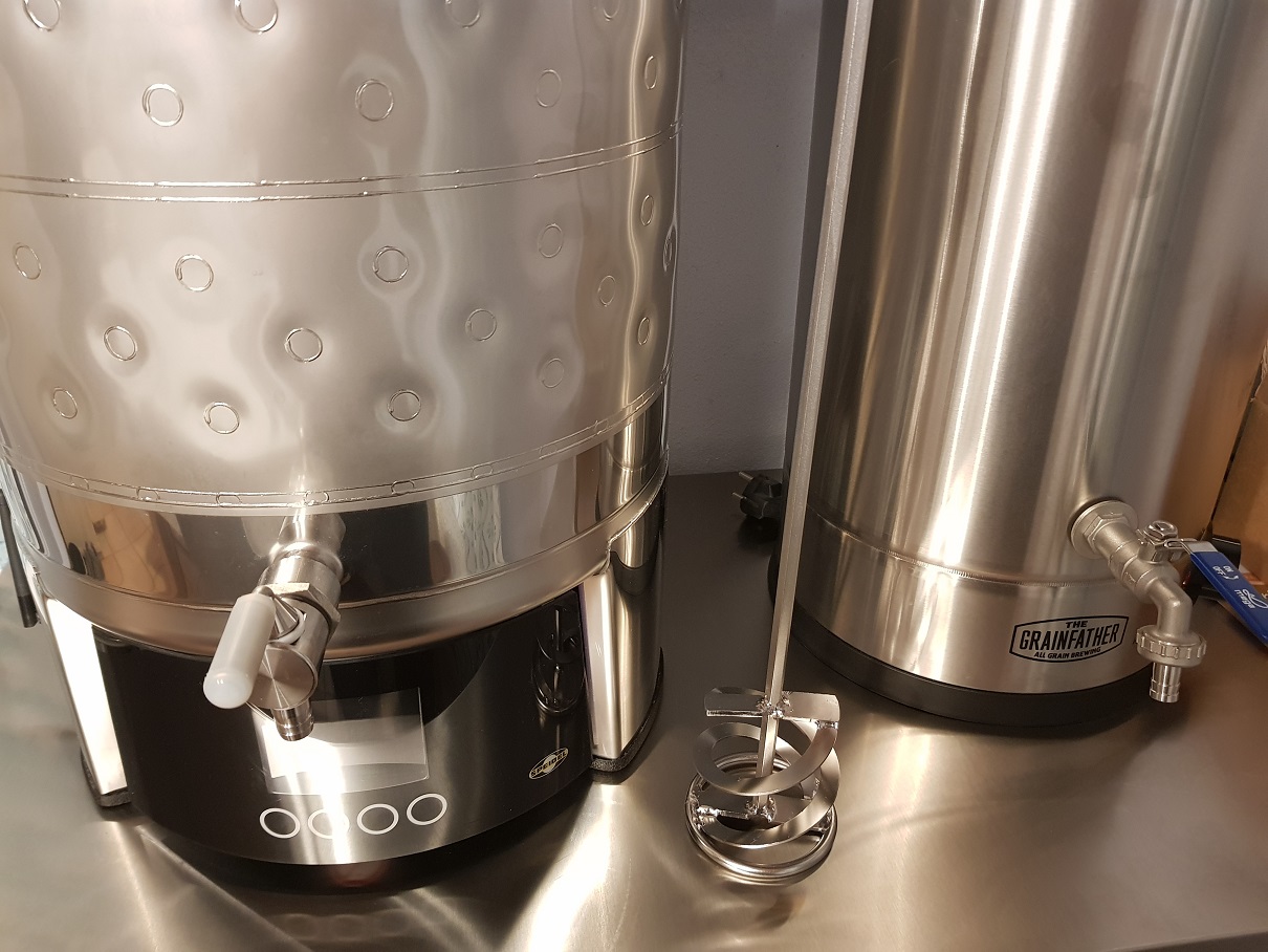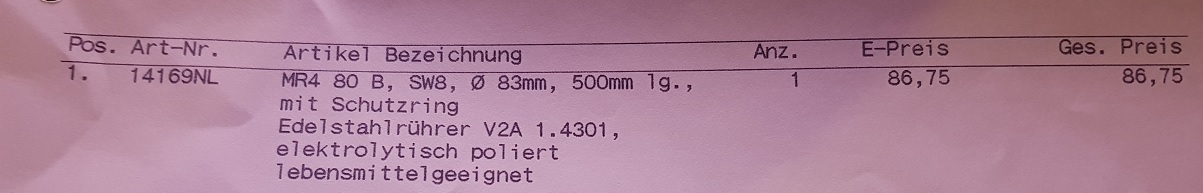 Bei meinem Rührer handelt es sich übrigens um die kleinere Version MR 5 90 SW8 V2A. Völlig ausreichend für Hobbybrauer, und lässt sich mit einem normalen Akkuschrauber antreiben.