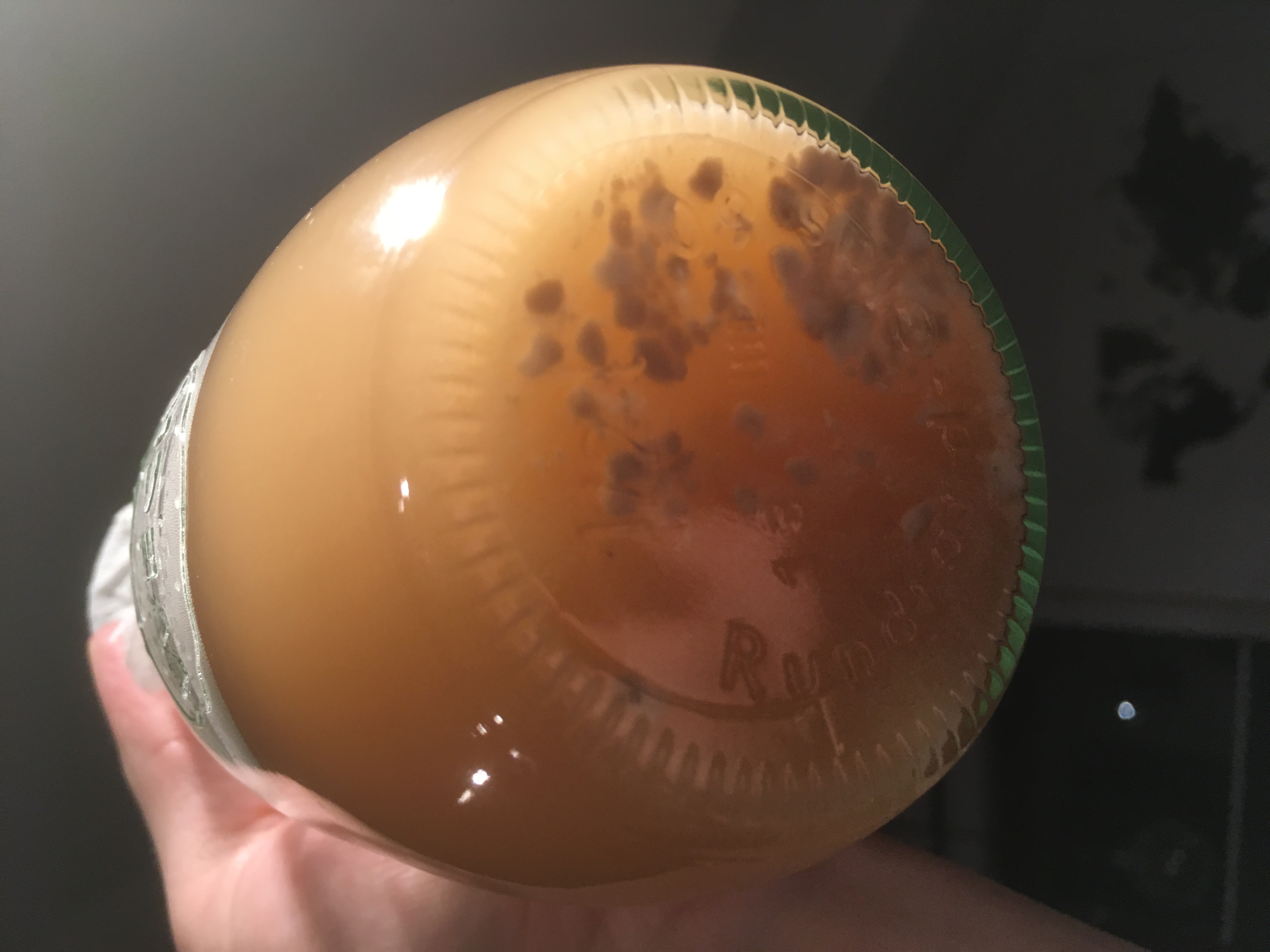 Aber als ich dann heute Abend das angeschaut habe sind mir beim aufschütteln der Hefe dunkle Flecken aufgefallen, die sich auch beim schwenken nicht aufgelöst haben.