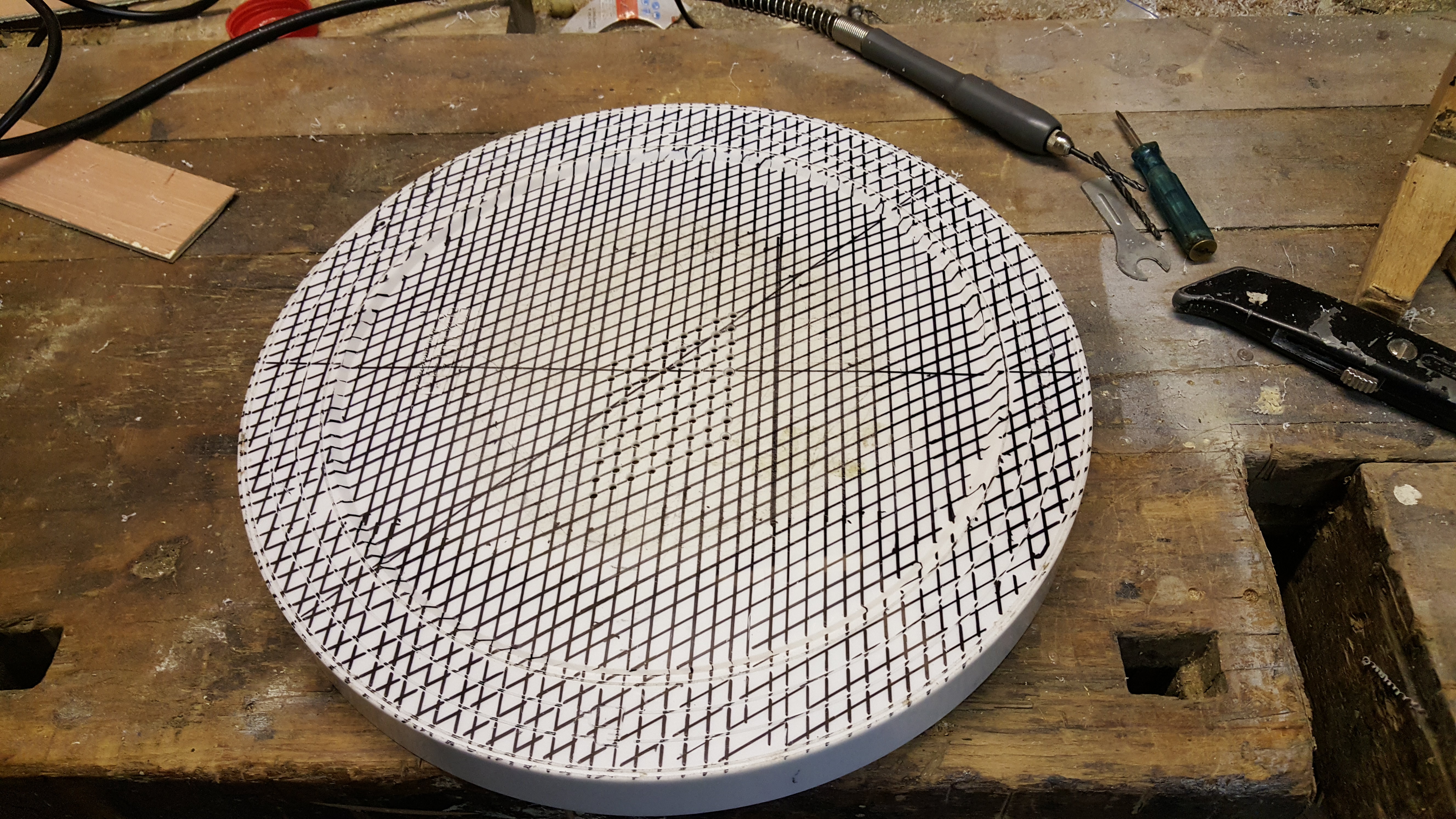 Der Boden wird in ein Sieb verwandelt. Die Linien sind mit 6mm Abstand eingezeichnet, die zweite Ebene ist um 60° gedreht: