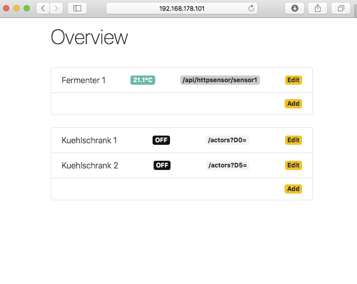 Hier gibt es auch die Varianten "Edit" und "Add", mit welchen Aktoren (bis zur Anzahl der verfügbaren Pins, also maximal 5 bzw. 7 wenn man auf das Display verzichtet) oder Sensoren (Eigentlich egal wie viele, ich hab sie derzeit auf 10 beschränkt) bearbeitet und hinzufügt werden können.
