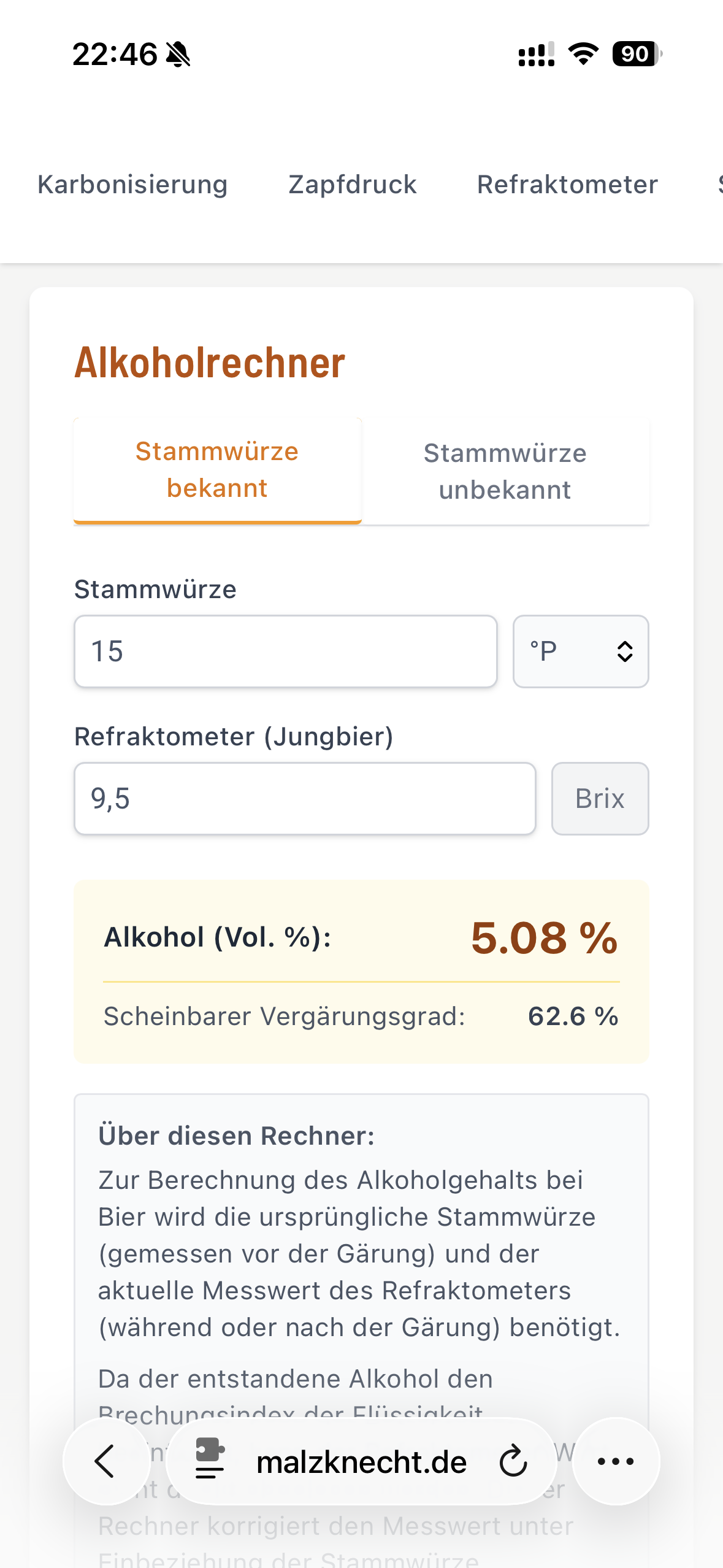 Auch mit einer zweiten Hefe und erhöhter Temperatur wollte die Gärung nicht wieder anspringen. Ich habe heute also eine Messprobe genommen und mit dem Refraktometer gemessen. Das sind die Ergebnisse aus MMuM:https://www.maischemalzundmehr.de/index ... rix=12%2C5