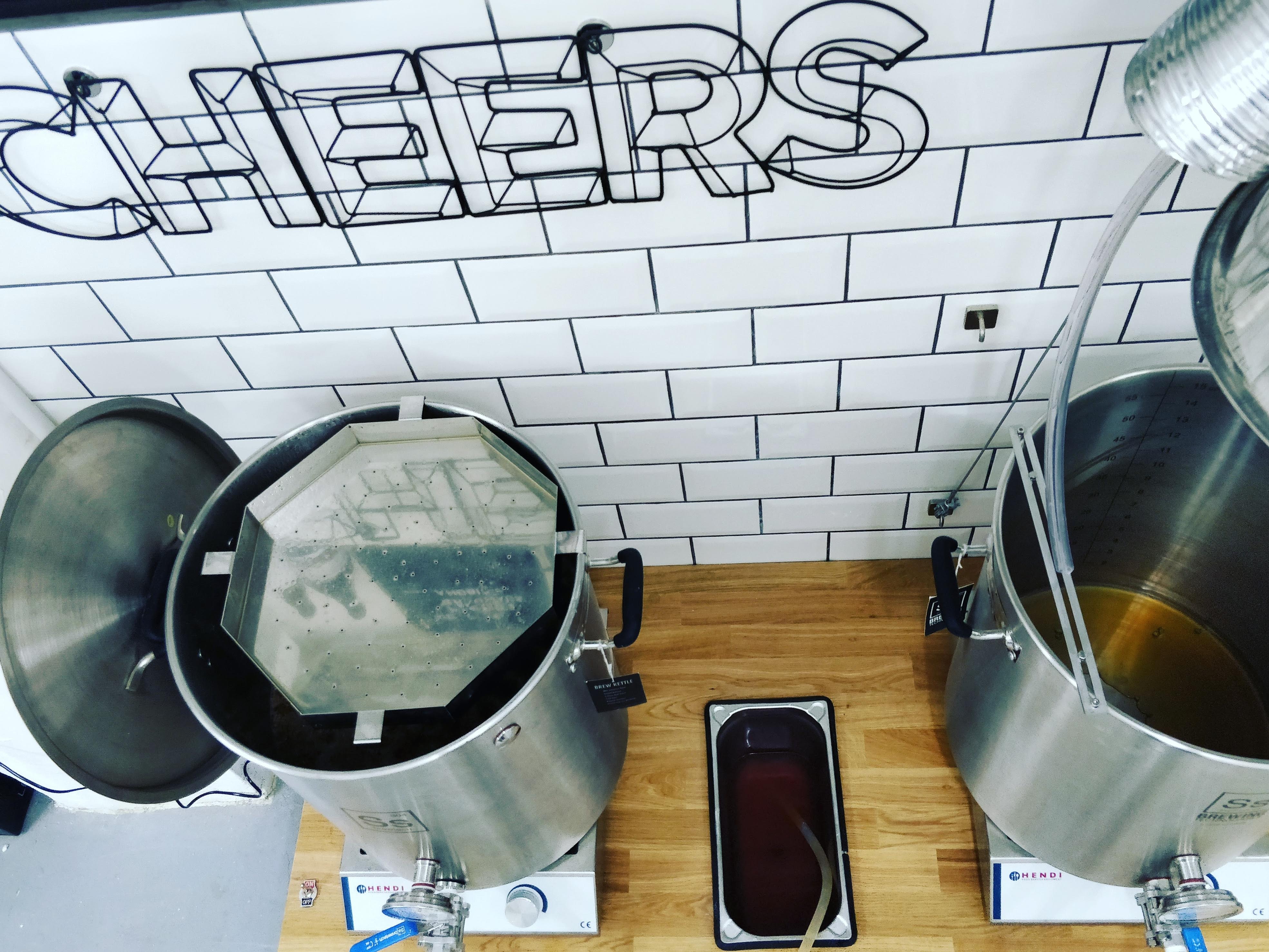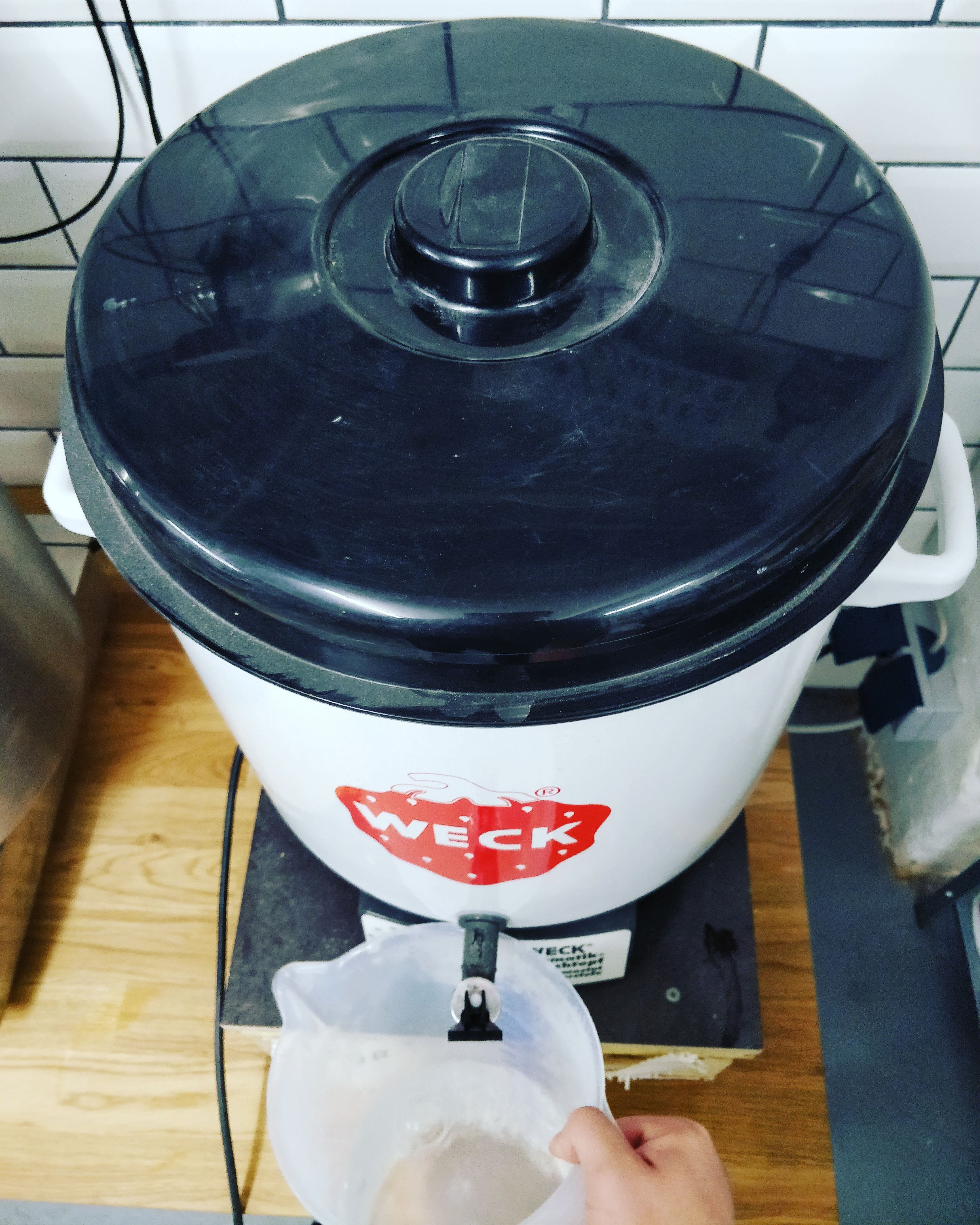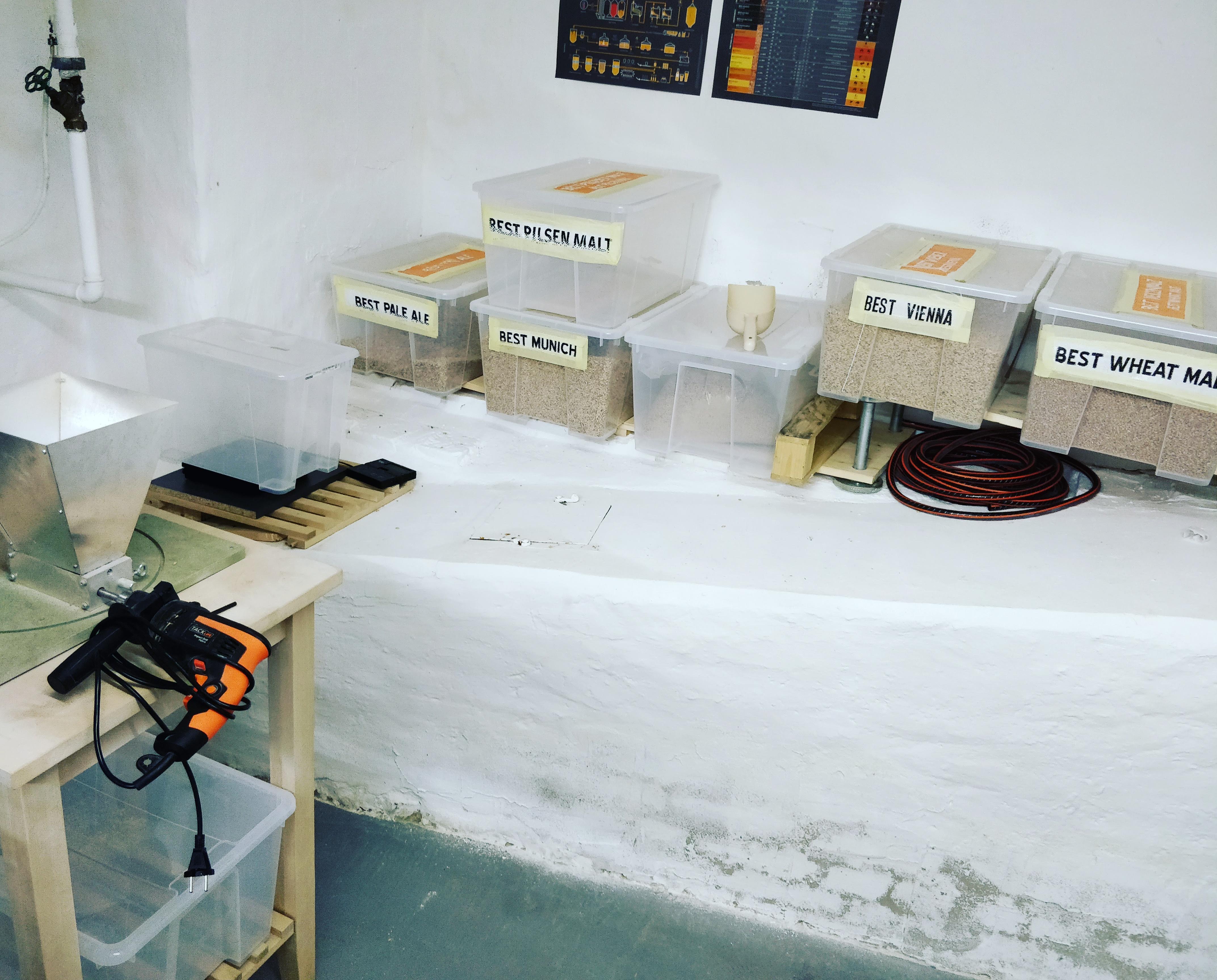 Ab geht´s in den Braukeller gegen 09:00 Uhr: Los geht`s mit dem Malz abwiegen: Schroten: Wasser mit Milchsäure etwas einstellen: Einmaischen: Rührwerk läuft: BKS 3000 ebenfalls: Läutern: Nachguss aufbringen: Dabei ist Zeit für ein Bierchen. Grisette mit Wacholder