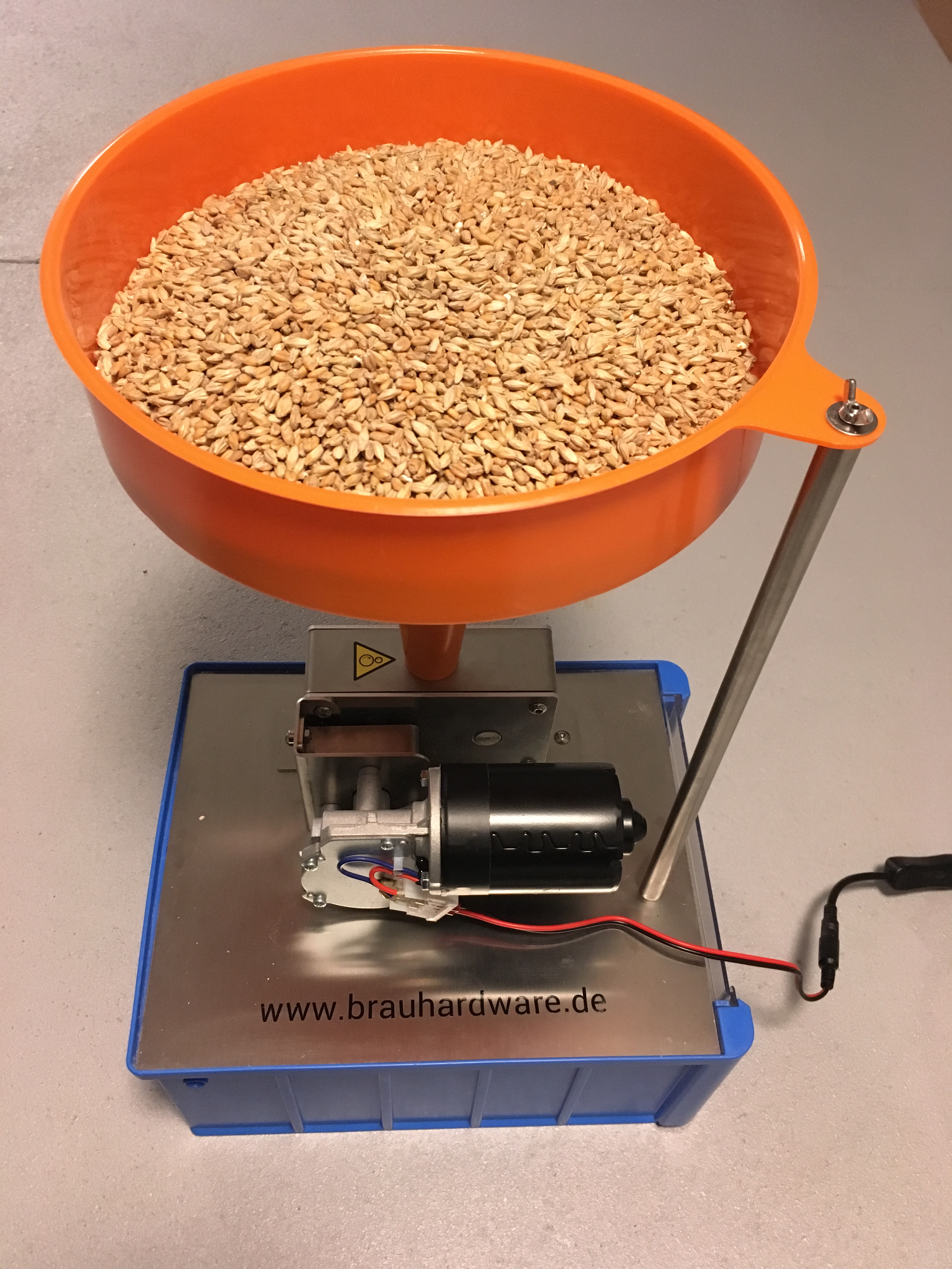 Los geht es mit dem Schroten. Das ganze Malz passt in den Trichter (etwa 2,5kg). 50:50 Weizenmalz und Pilsner Malz