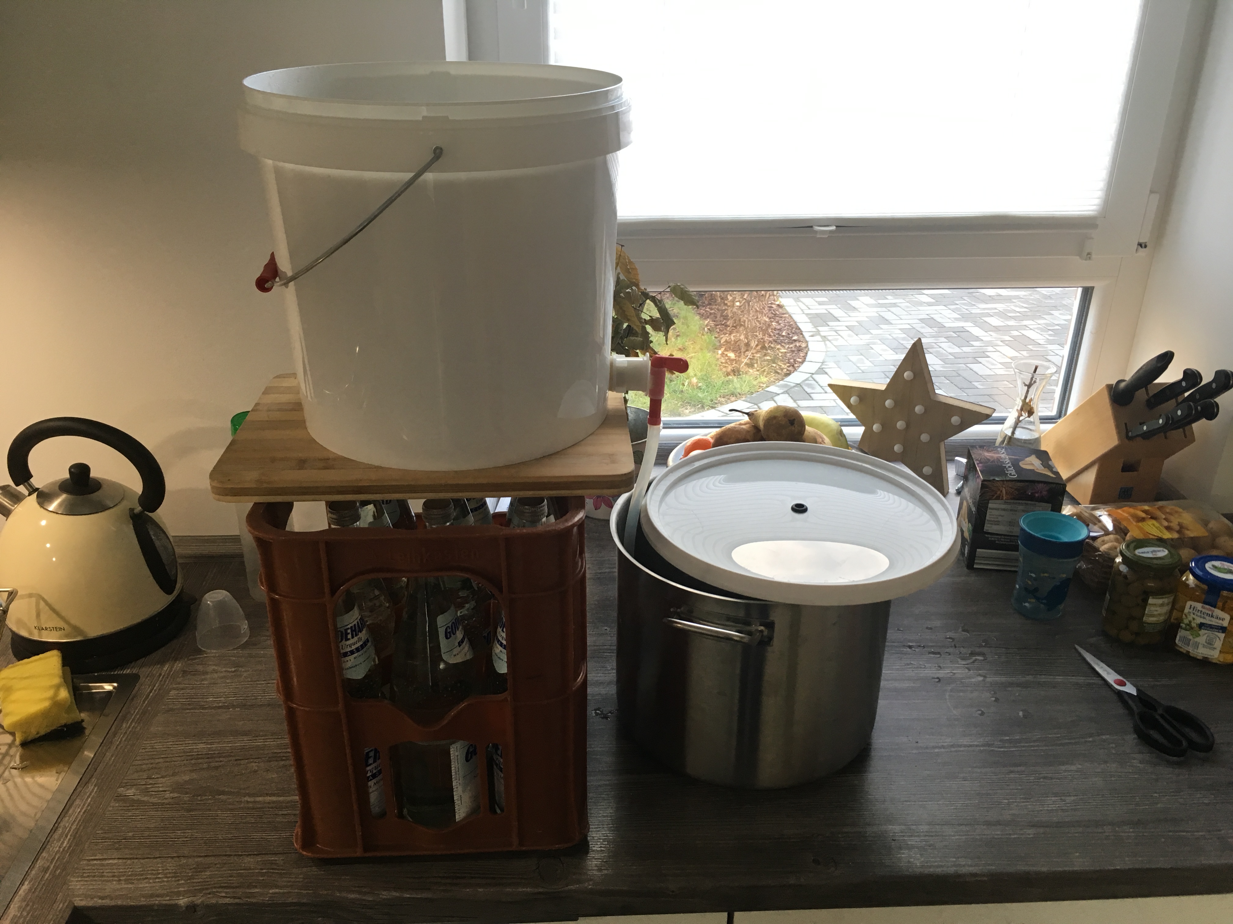 Meine Anlage beschränkt sich nun auf einen 14 Liter Topf und einen 17 Liter Gäreimer. Der Topf passt in den Gäreimer und alles nimmt wenig Platz weg, wenn es verstaut wird. Ich verzichte im Übrigen nun auf das ganze Technikgerödel und nutze den heimischen Herd als Energiequelle, analoge Thermometer und keine Steuerung. Was ich nicht weglassen kann, ist natürlich ein Rührwerk ;-).