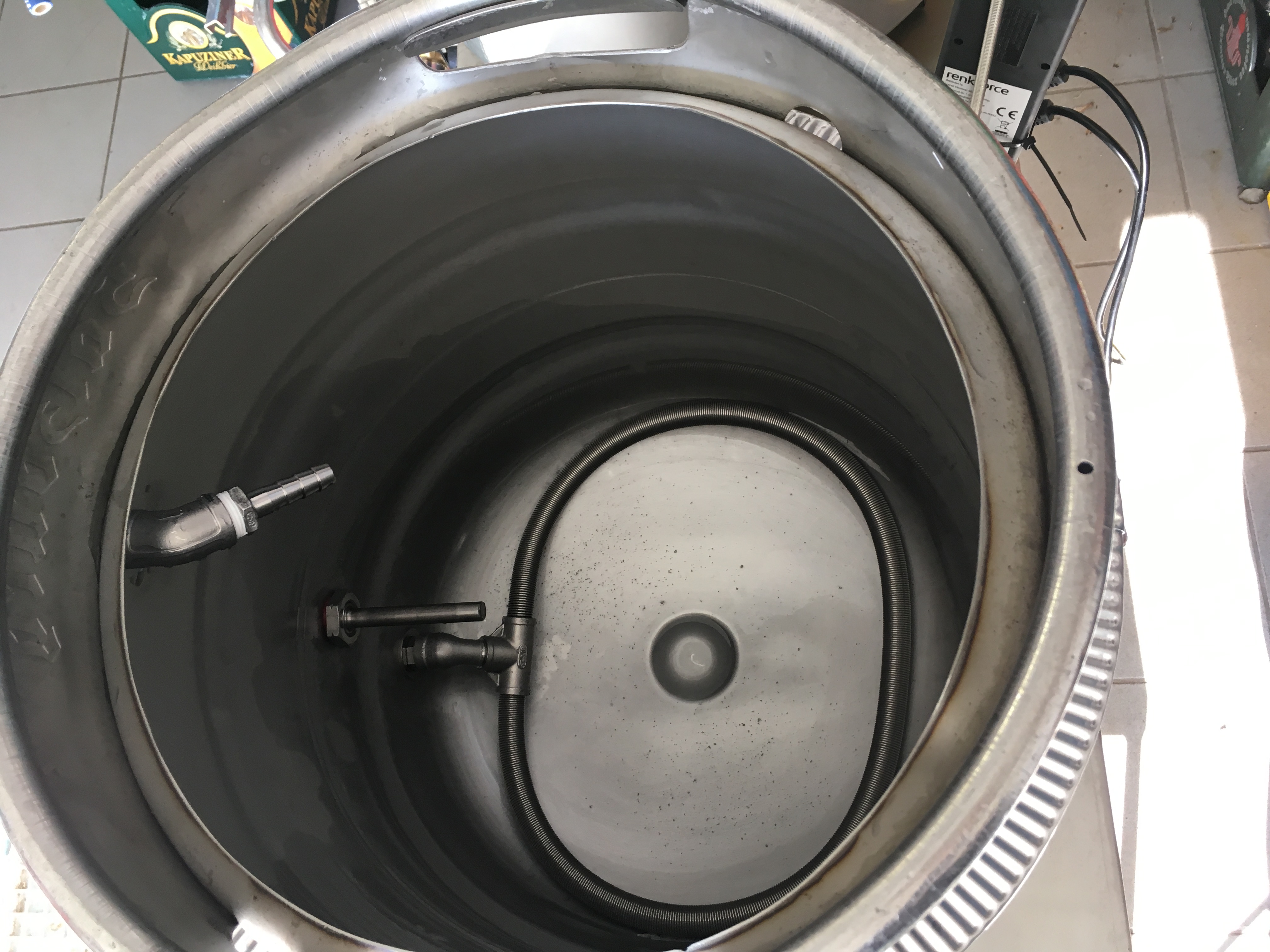 Es wurde der Thermoport 38ltr ersetzt. Ich wollte unbedingt den Ausstoß etwas erhöhen. Also wurde als neuer Maische- bzw. Läuterbottich ein ausgemustertes 50er KEG umgebaut.