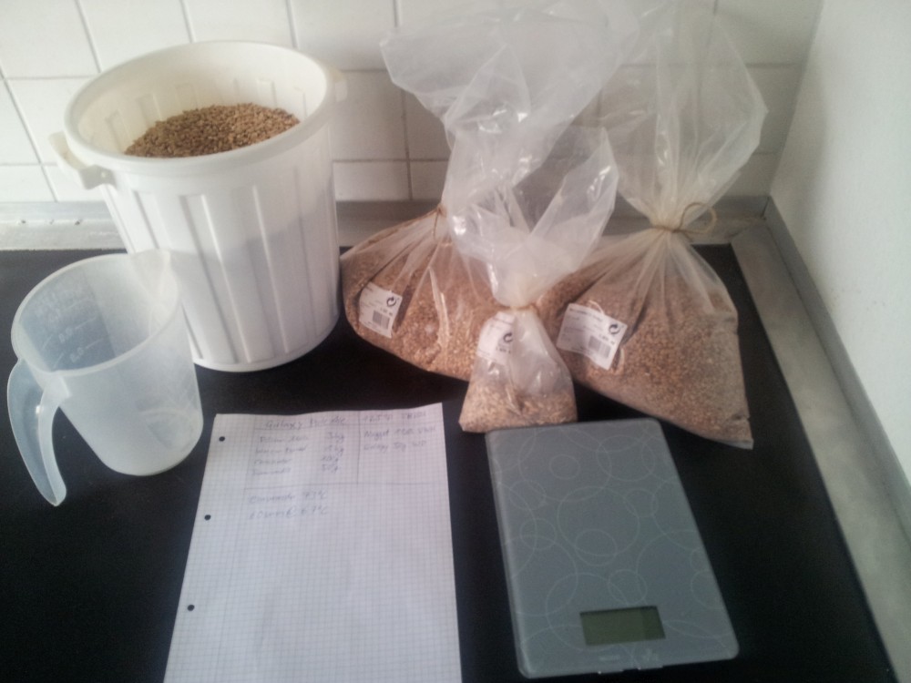 Die Schüttung besteht aus 3kg Pilsener Malz, 1kg dunkles Weizenmalz und 100g Caraamber. On Top noch 50g Sauermalz um die Restalkalität, meines wunderbaren Düsseldorfer Brauwassers, noch etwas zu senken.