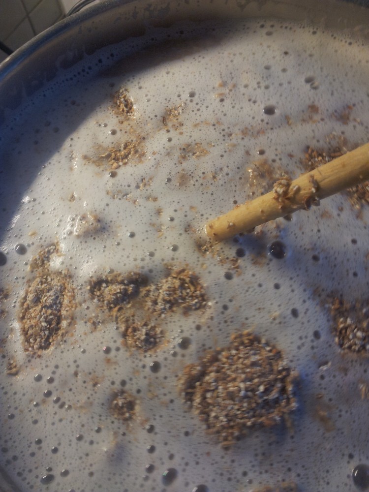 Sieht man auch an der Maische. Bißchen Platz ist noch da, also zubrühen und die Plämpe auf Verzuckerungstemperatur bringen. Weiter rumrasten...