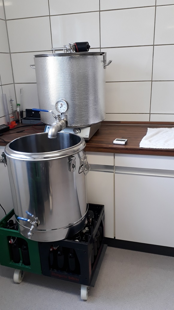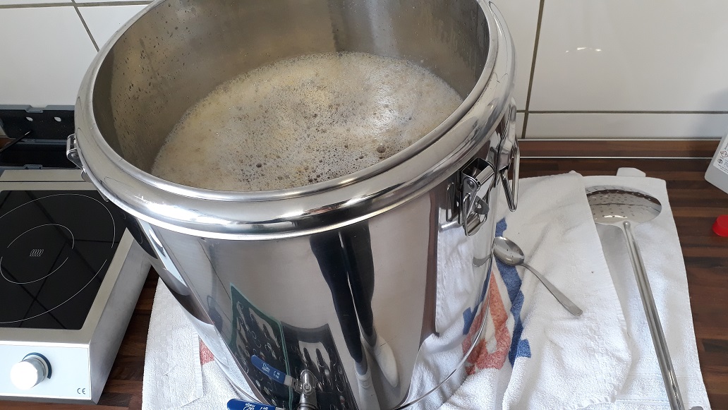 die 57l in dem Fall sind ja vor dem Kochen. Ich läutere die in den Topf der schon auf der Kochplatte steht. Die Ausschlagswürze von in diesem Fall 48l (Vor Hopfenseihen) hebe ich mit einem Brauhelfer auf die Arbeitsplatte und lasse dann ins Gärfass ab. Keine Pumpe. Benutze immer Monofilamentfilter beim Abfüllen in das Gärfass.