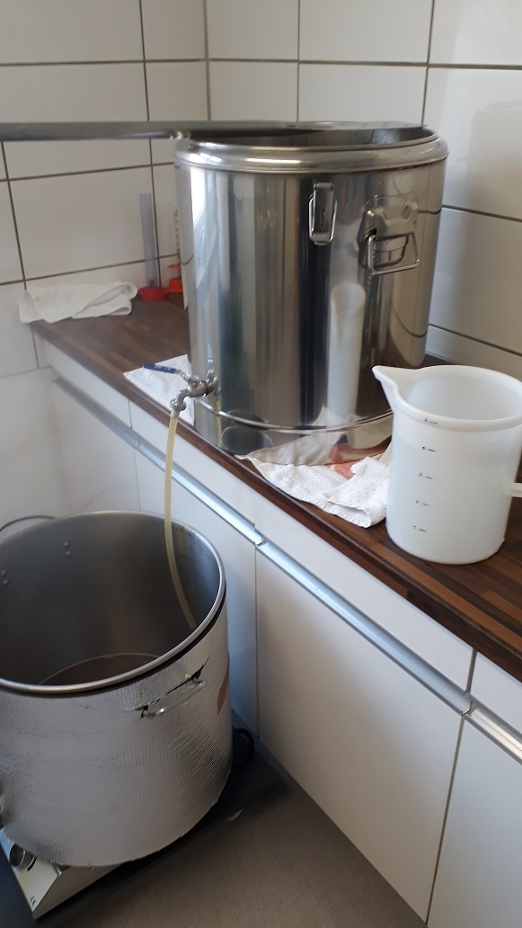 Irgendwann wird logischerweise abgemaischt. Andere haben hier sehr schöne Tische und Vorrichtungen, ich nehm halt zwei Bierkisten und stell den Thermobehälter mit Läuterhexe drauf und mach den Hahn auf. Manchmal hieve ich das Ganze dann selbst auf die Arbeitsplatte, in diesem Fall hat aber meine treue Brauhelferin (und Ehefrau) ausgeholfen. Generell braue ich lieber allein, die Konzentration ist einfach viel höher.