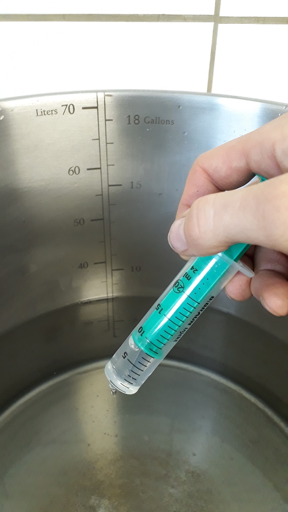 die 57l in dem Fall sind ja vor dem Kochen. Ich läutere die in den Topf der schon auf der Kochplatte steht. Die Ausschlagswürze von in diesem Fall 48l (Vor Hopfenseihen) hebe ich mit einem Brauhelfer auf die Arbeitsplatte und lasse dann ins Gärfass ab. Keine Pumpe. Benutze immer Monofilamentfilter beim Abfüllen in das Gärfass.