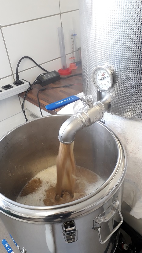 Irgendwann wird logischerweise abgemaischt. Andere haben hier sehr schöne Tische und Vorrichtungen, ich nehm halt zwei Bierkisten und stell den Thermobehälter mit Läuterhexe drauf und mach den Hahn auf. Manchmal hieve ich das Ganze dann selbst auf die Arbeitsplatte, in diesem Fall hat aber meine treue Brauhelferin (und Ehefrau) ausgeholfen. Generell braue ich lieber allein, die Konzentration ist einfach viel höher.
