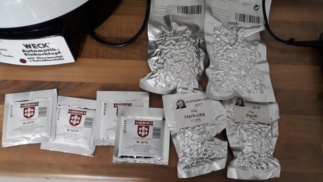 Zum ersten Mal setze ich Herkules als Bitterhopfen ein. Der war noch von einem geplanten Projekt übrig und ich wollte den gar nicht nehmen. Ich weiß nicht warum, aber für mich hat der hohe Alphasäurengehalt mit dem Namen irgendwie den Eindruck hinterlassen, das sei ein schnöder Bitterhopfen den man sonst so gar nicht brauchen könnte. Das Öffnen des Packs hat mich eines besseren belehrt: Holla die Waldfee, was für ein geiler fruchtiger Geruch kommt hier raus?! Der passt gut zum Spalter Select.