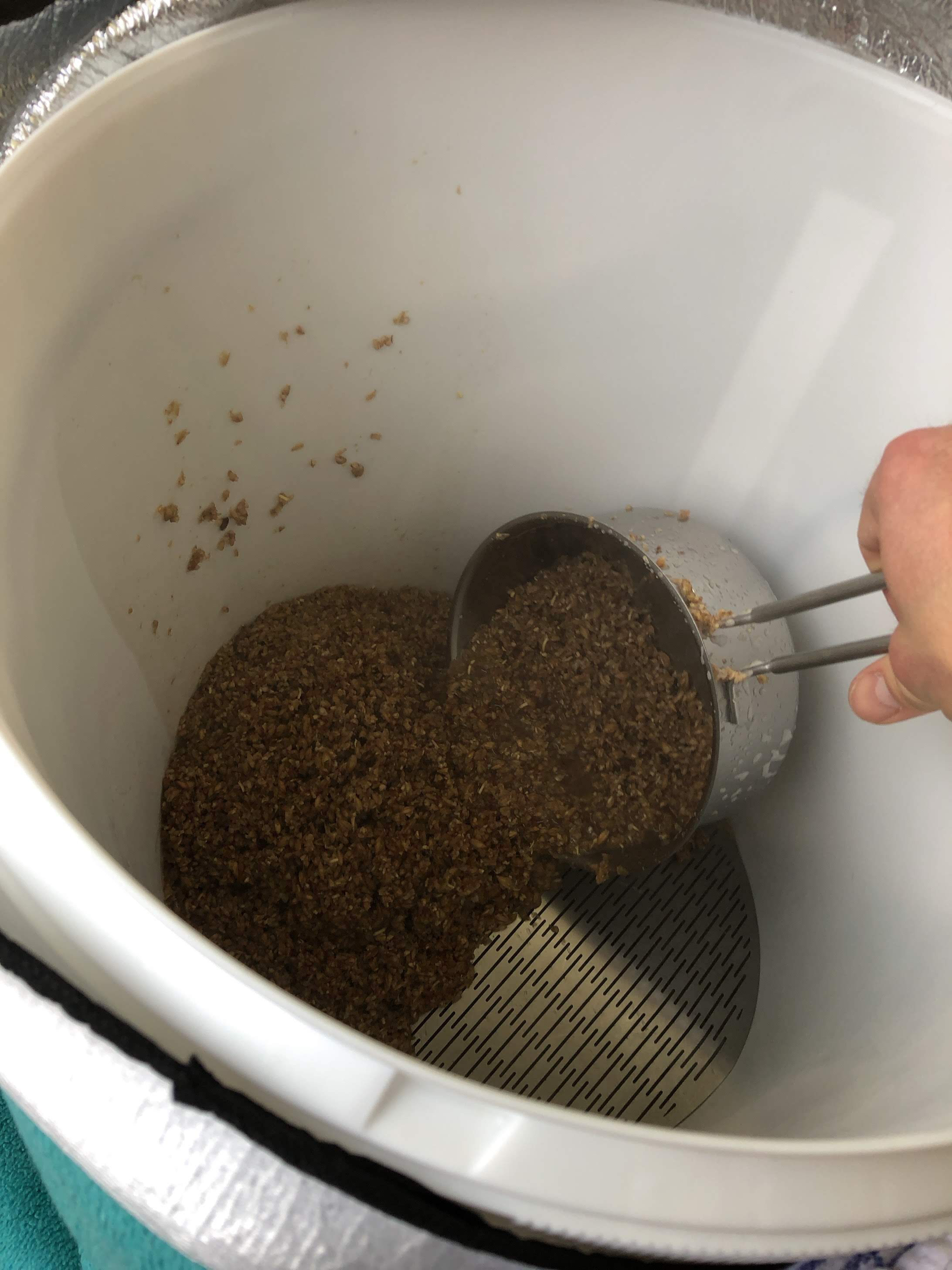 von daher gehe ich den NG ganz entspannt während der Läuterruhe an Weiter gehts, vorschießen lassen und wieder auf den Läuterbottich geben Ich mache das Old-School mit der Kelle Dann wird laufen gelassen... Den Nachguss gebe ich natürlich mit drüber Um Zeit zu sparen, heize ich den Topf mit der Würze schon an Während der letzte NG läuft, hole ich die Hopfen-Box aus dem Froster und wiege ab Der ausgelutschte Treber... Hopfenkochen und erste Hopfengabe Nach 65 Minuten Kochzeit schalte ich ab, und bin leicht über mein Ziel hinausgeschossen -