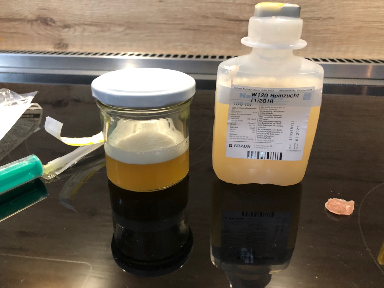 Dann den Starter gut runterkühlen und sedimentieren lassen (1-4°C). Je mehr Zeit du hast, desto besser wird die Hefe sedimentieren. Zuerst hast du nur unterschiedlich trübe Schichten, später klare Würze und einen Bodensatz. Trübe Schichten nicht wegschütten, klare Würze(-schichten) schon.