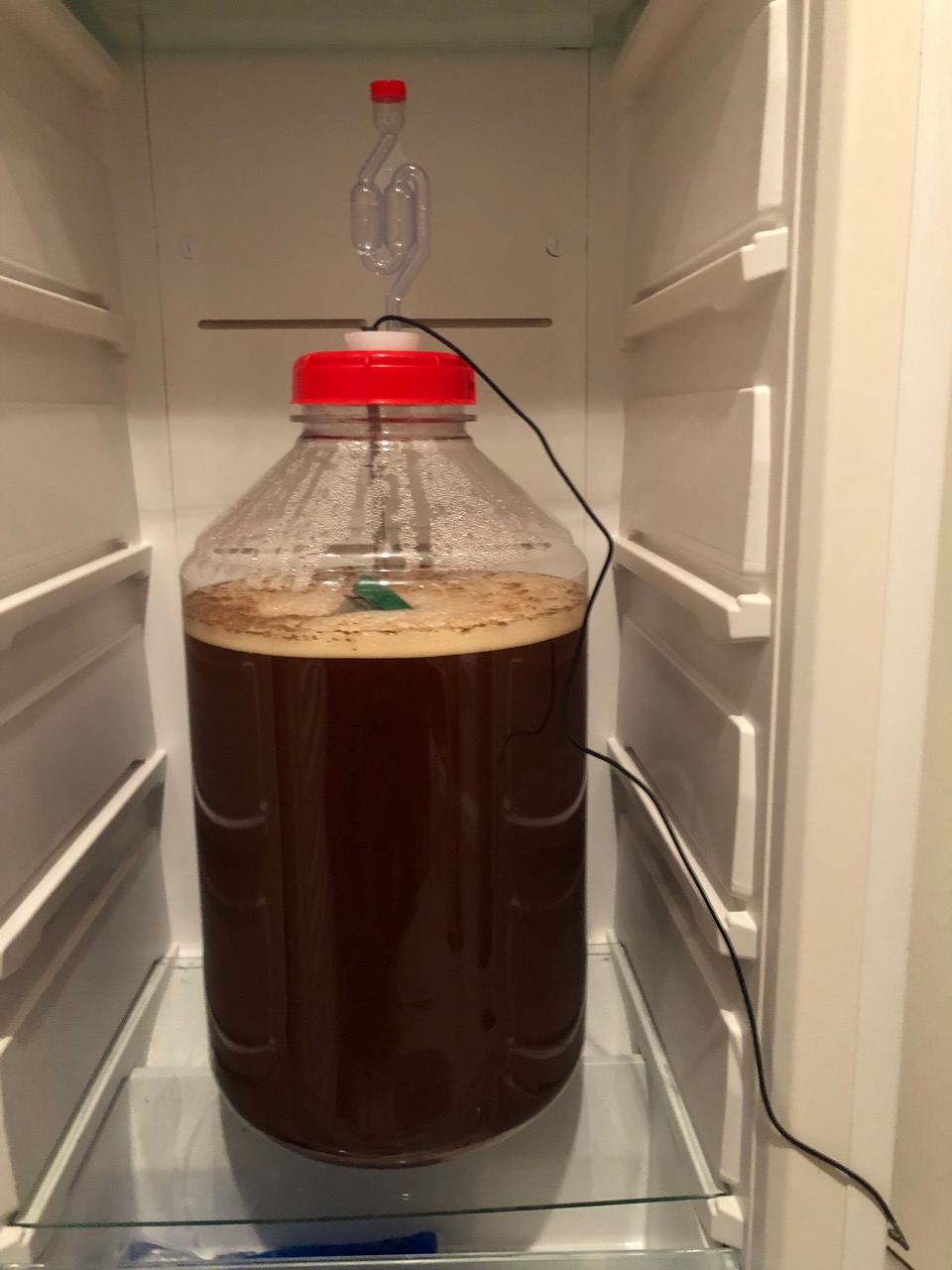 Das ist ein Miele Gefrierschrank, ca. 170 cm hoch, betrieben mit Inkbird. Zwischen den Schubladen waren so Glasplatten eingelegt, die halten den 20l Gärbottich gerade so. Das wollte ich aber mal mit eine Siebdruckplatte ersetzen.