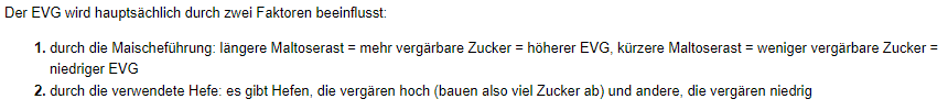 Dass die Hefe durchaus einen Einfluss auf den EVG hat, schließe ich u.a. aus Jans Schwarte, Seite 35 linke Spalte unten: "So können manche Hefen mit der Maltotriose etwas anfangen, andere nicht."; ebenda, S. 116f "... dieses Enzym bestimmt maßgeblich, wie viel Alkohol später im Bier entsteht, da viele Hefen Zucker nur bis zur Maltose..." (Unterstreichungen durch mich).
