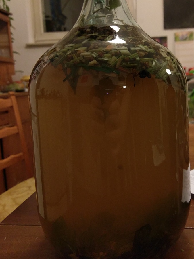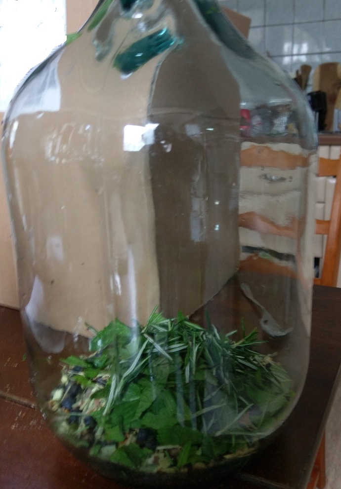 Ich habe die Gewürze zunächst 24 Stunde lang in 1,4 l 70-prozentigen Ethanol eingelegt, dann mit einem l alten Wodka (stand lange dumm rum) und 2,8l Korn aufgefüllt und noch mal 12 Stunden stehen lassen.