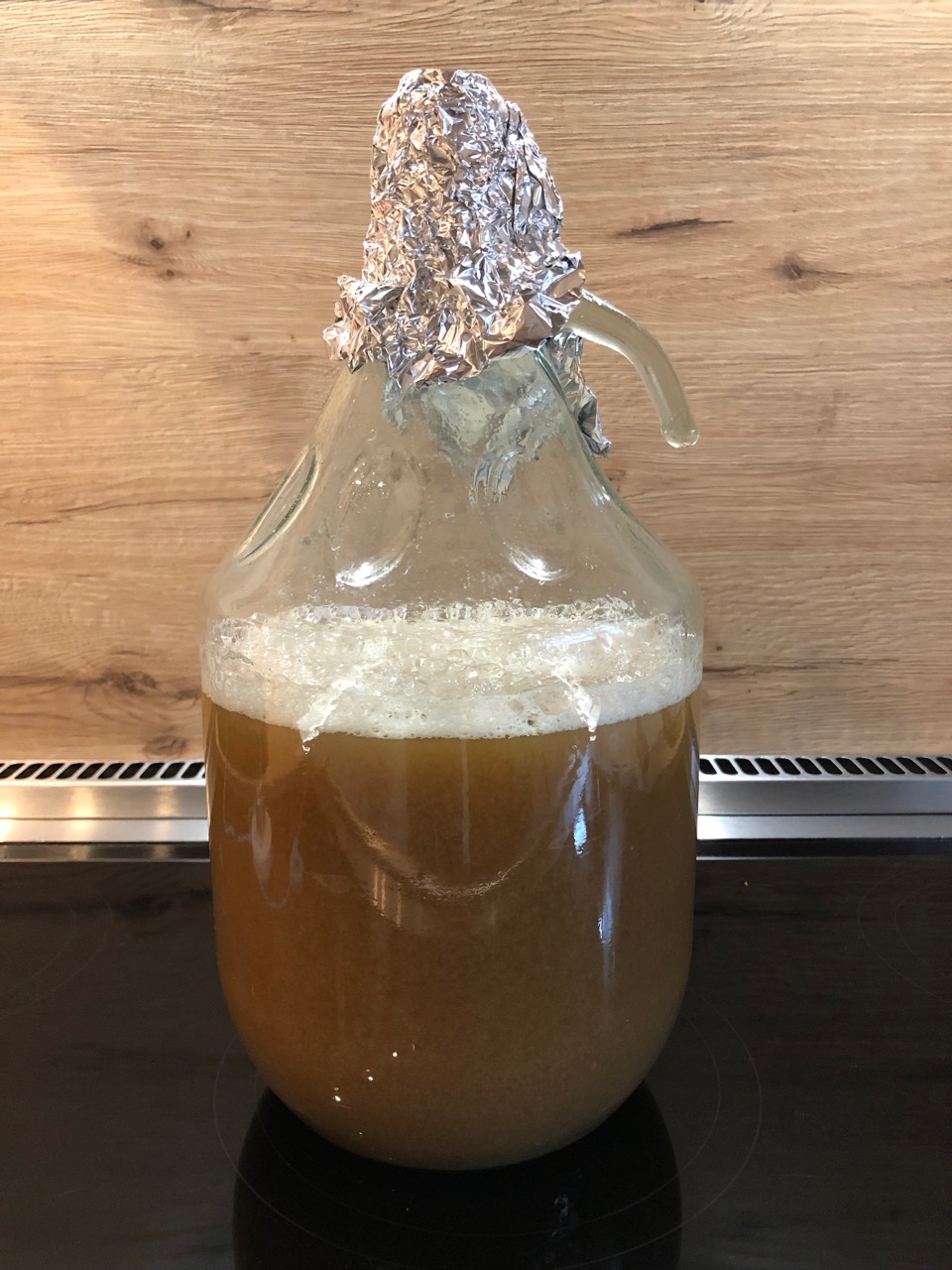War alles unauffällig, also habe ich die Würze noch mal für ca. 30 Minuten gekocht. Nach dem Foto kam der Deckel drauf, damit nichts reduziert wird. Daneben ist die zweite Stufe zu sehen, schön Hefetrüb und leichte "Kräusen" auf der Oberfläche.