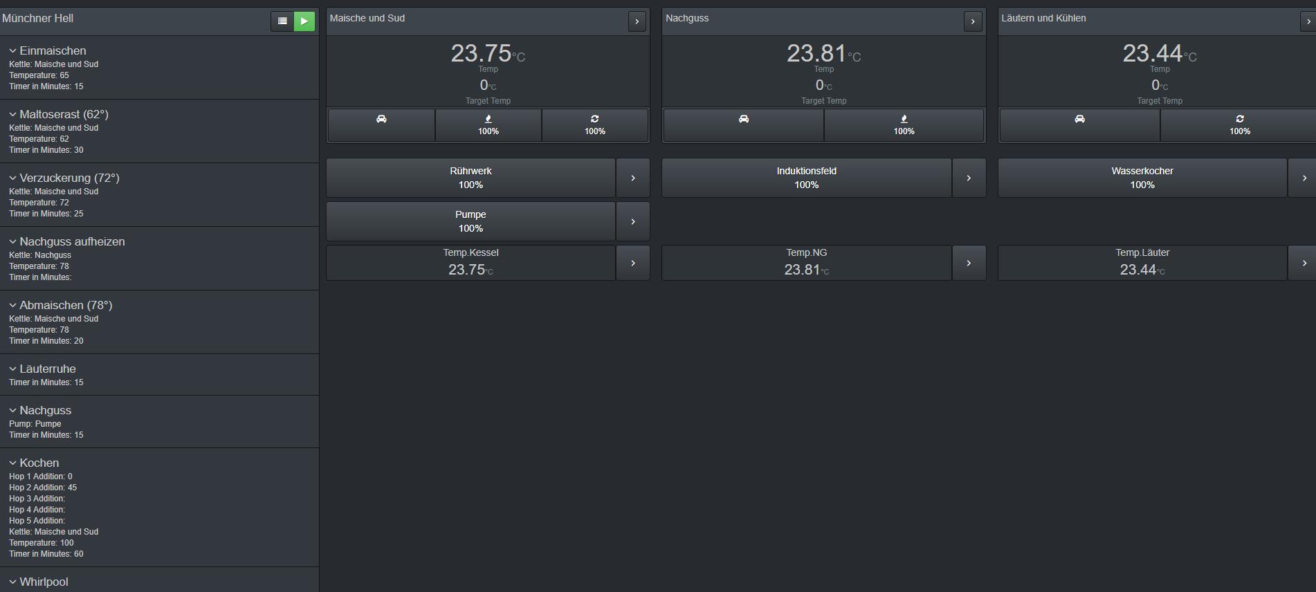 Ich habe die Hendi an einer Funksteckdose. Den Einkochtopf für den Nachguss habe ich ebenfalls an einer Funksteckdose. Die Steckdosen werden dann per CbPi gesteuert. Pumpe und Rührwerk hab ich an einen Relais.