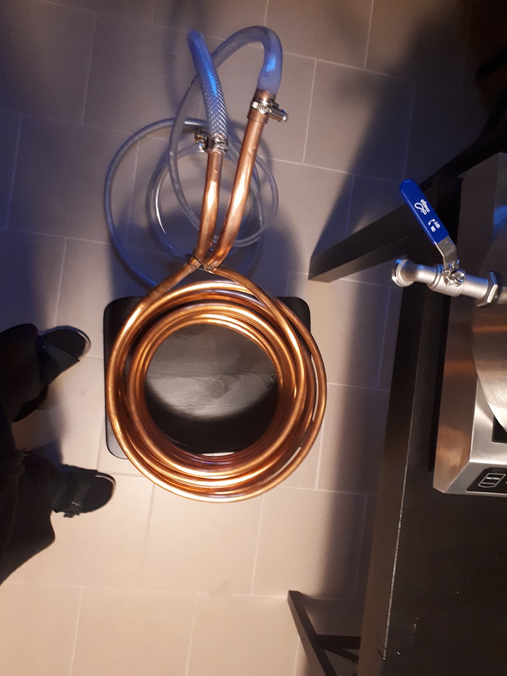 Nach dem Zusammenbau habe ich natürlich gleich mal einen Test gefahren, ca 25L Wasser zum Kochen gebracht mit der Spirale drin. Das ganze ca 5 Minuten kochen lassen. Danach Heizplatte aus und Wasser für die Kühlspirale auf. Die Wassertemperatur des Kaltwassers betrug ca 12°C.