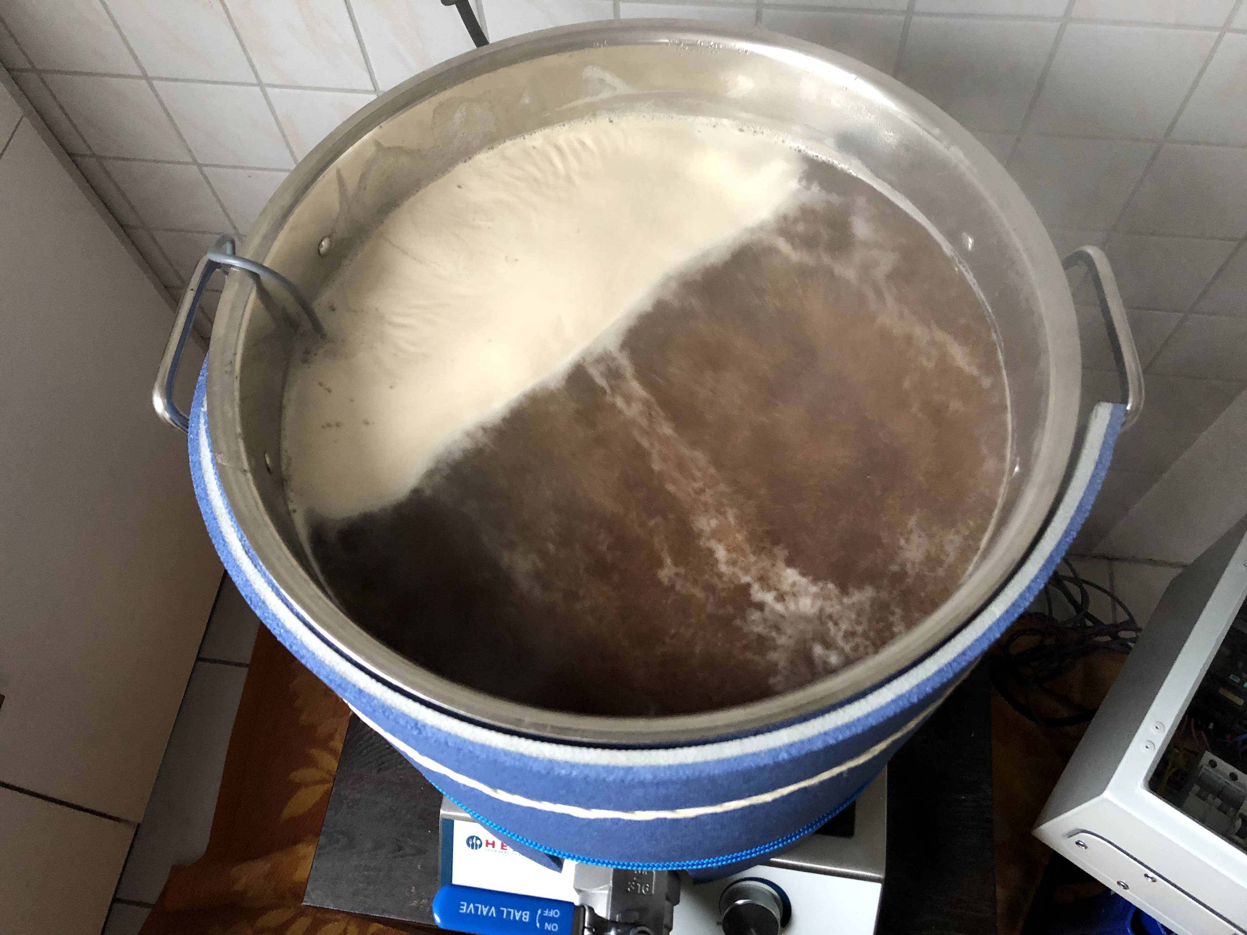So dann hab ich gemerkt, dass ich den Kühler noch drin hab, dann wären das nur noch 25 Liter…. Was zum Henker….?!?! Dann ist die Suppe auch noch ziemlich trüb trotz Moss…. Ist das normal oder wirkt das Moss erst beim Gären?? Kühler raus, dabei den Schlauch aus Versehen gelöst und die Küche noch kurz unter Wasser gesetzt…. Jetzt brauch ich mindestens noch n Starkbier…
