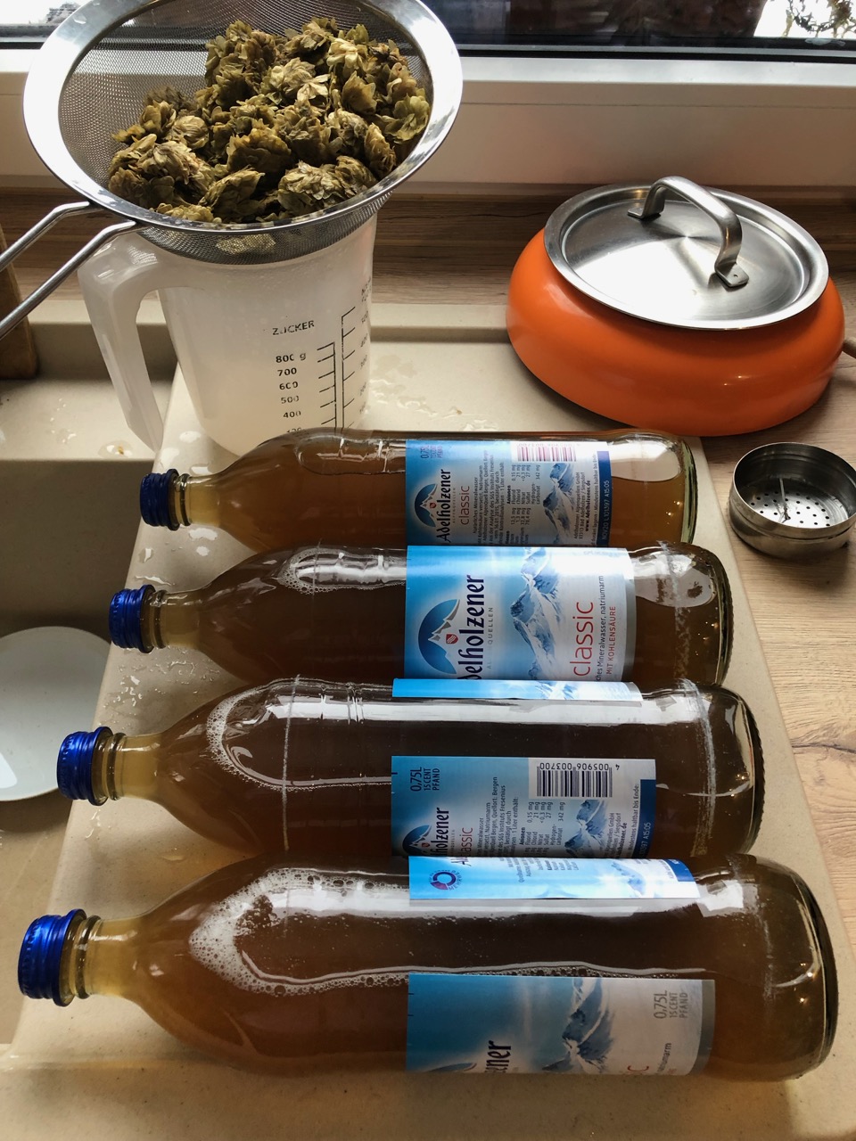 Ich hatte die Starterwürze gestern kochend heiss in die Flaschen gefüllt und direkt verschlossen auf die Seite gelegt. Dann draußen bei 1°C abgekühlt und anschliessend im Kühlschrank gelagert. Da sollte sich doch nichts eingeschlichen haben... :Waa