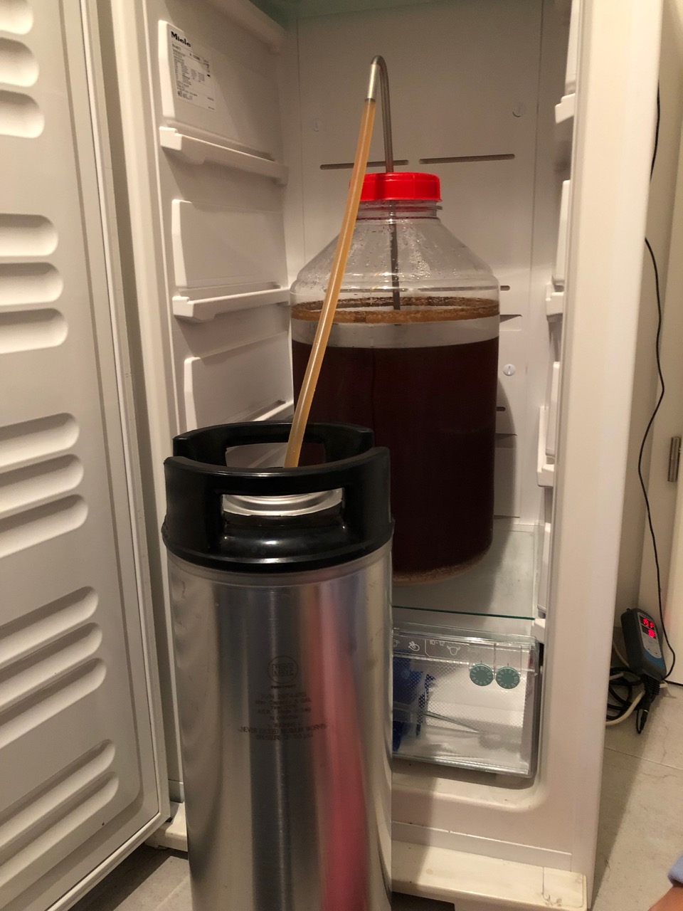 Das ist ein Miele Gefrierschrank, ca. 170 cm hoch, betrieben mit Inkbird. Zwischen den Schubladen waren so Glasplatten eingelegt, die halten den 20l Gärbottich gerade so. Das wollte ich aber mal mit eine Siebdruckplatte ersetzen.