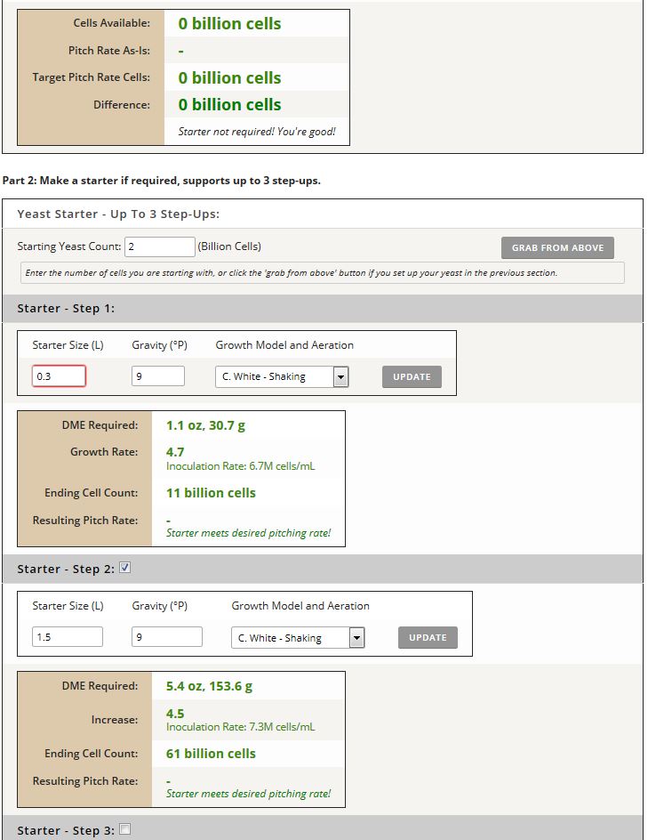Ich bin nekromantisch und reaktiviere diesen Thread: Der Calculator von Brewersfriend rechnet bei jedem Propagationsschritt DME dazu. Klar. Aber ist das insgesamt zu verstehen oder als jede Gabe einzeln? Beispiel: In Schritt 1 benötige ich bei einem Liter 100 g DME, in Schritt 2 bei 2 Litern 200 g DME. Sind die 200 g Gesamtmenge oder additiv zu den 100 g zu verstehen? Machte ich 3 Schritte zum Verhältnis 1-2-3, wären das ja am Ende 6 Liter Starter… kann kaum sein - oder?Enfield hat geschrieben: Montag 21. August 2017, 10:29 Ich habe mich etwas durch das Buch "Yeast" gequält und soweit ich verstanden habe, sollte die "inocculation rate" am optimalsten um die 67 Millionen Zellen pro ml liegen für die beste Wachstumrate im Verhältnis zur Startergröße.