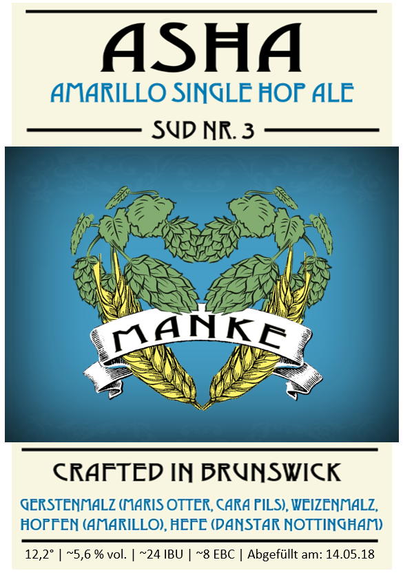 So, jetzt wird es Zeit, dass ich auch mal unsere Etiketten vorstelle. Hauptsächlich kreiert das meine Frau, aber ich gebe dann immer mal meinen Senf dazu. So hat sich dann zum Beispiel das ASHA Etikett nochmal ein wenig verändert. Dabei ist dann auch ein wenig Input von anderen Brauern der Umgebung.