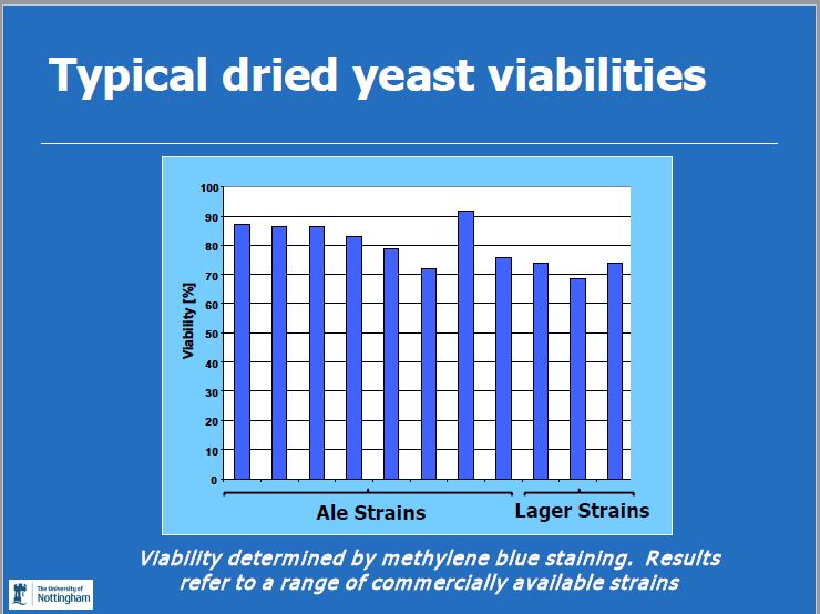Ich habe mal aus Spaß eine 2 Jahre alte Lallenand "Nottingham" und eine 6 Monate alte Godzilla "Notty" rehydriert und mit Methylenblau eingefärbt. Die Lallemand hatte locker 95% lebende Zellen und die Godzilla weit über 80%.
