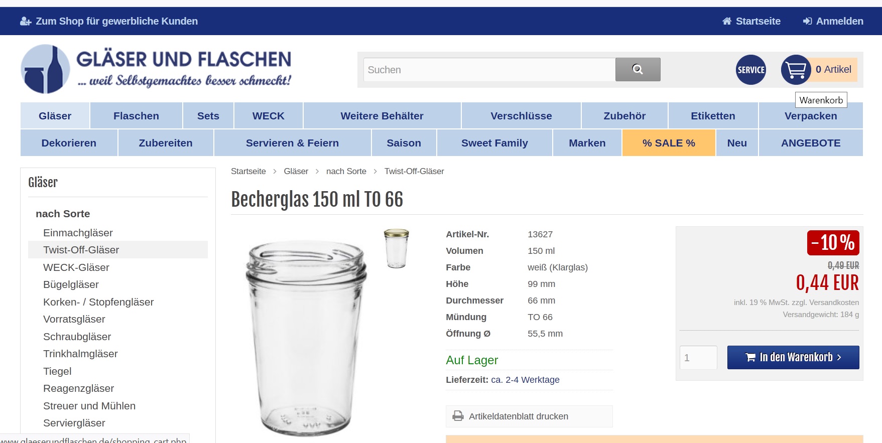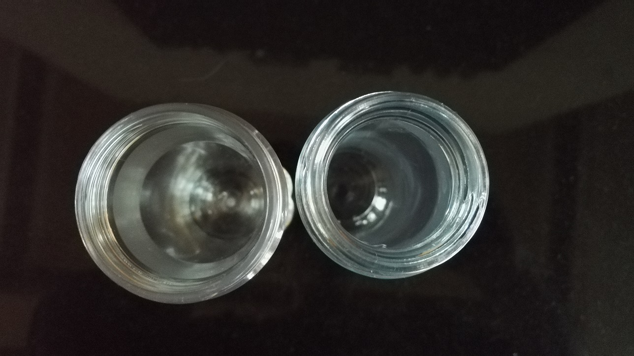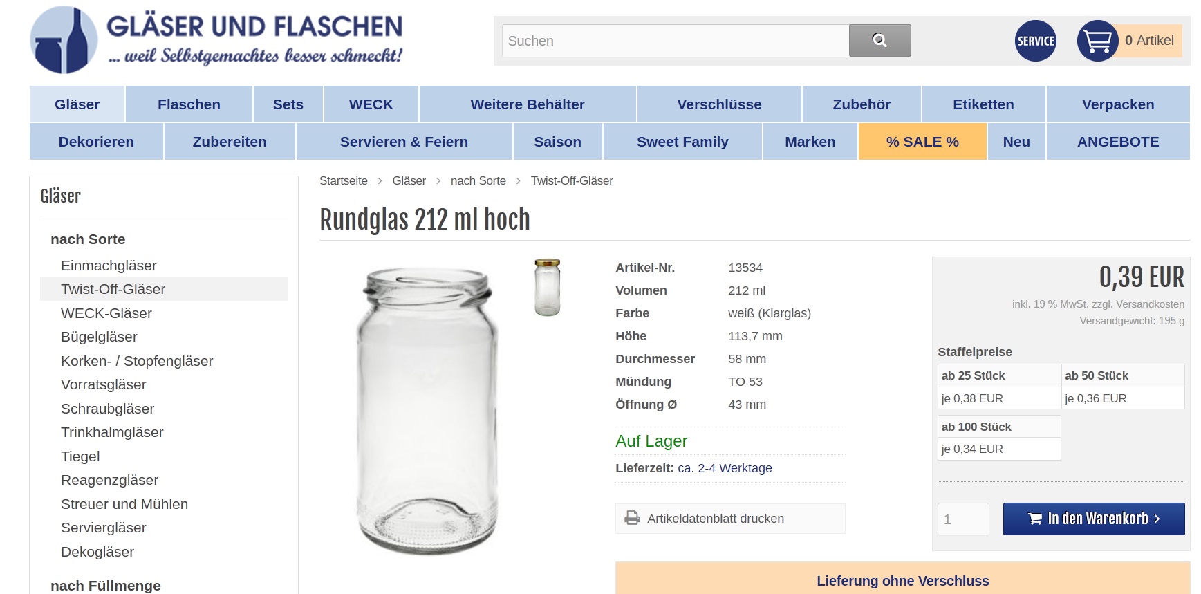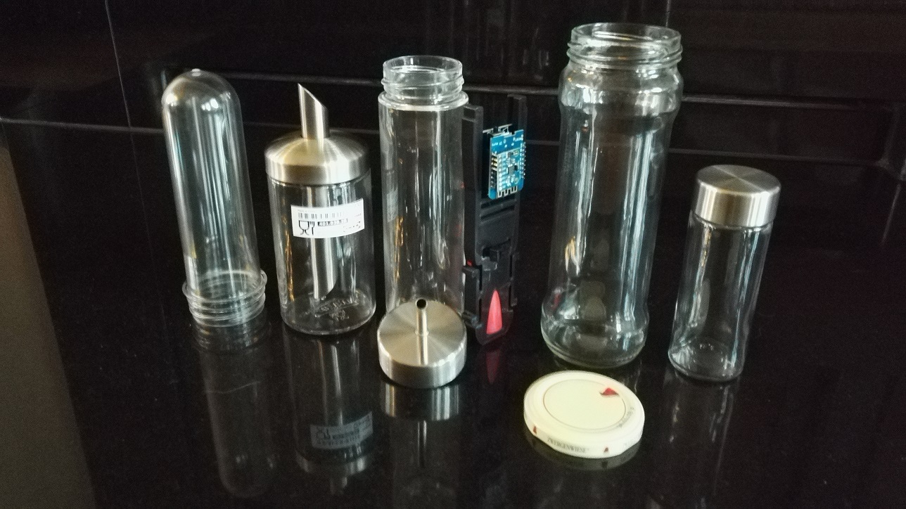Zwischenzeitlich hab ich mit einigen Glasherstellern bzw. -lieferanten telefoniert und gemailt. Das Problem ist, dass es selbst bei Weithalsgläsern und -flaschen schwierig ist, kleine Gefäße mit einer genügend großen Öffnung zu bekommen (ich bin hier von den 39mm des PETlings ausgegangen). Gerade im Gewindebereich ist das Glas hier immer nochmal verstärkt und nach innen gewölbt, so dass es eigentlich erst bei einem Volumen von 500 ml los geht. Wenn aber das Verhältnis von Höhe zu Volumen zu gering wird, wird das ganze zu instabil. Dann braucht man auch wieder soviel Balastgewicht, dass der Deckel bei den Neigungen in die Flüssigkeit reicht...