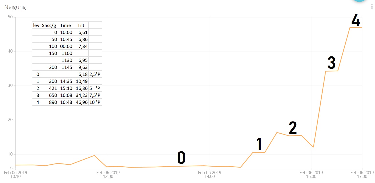 - Die Zuckergehaltsstufen und die Neigungen der iSpindel im "Zwergenglas"