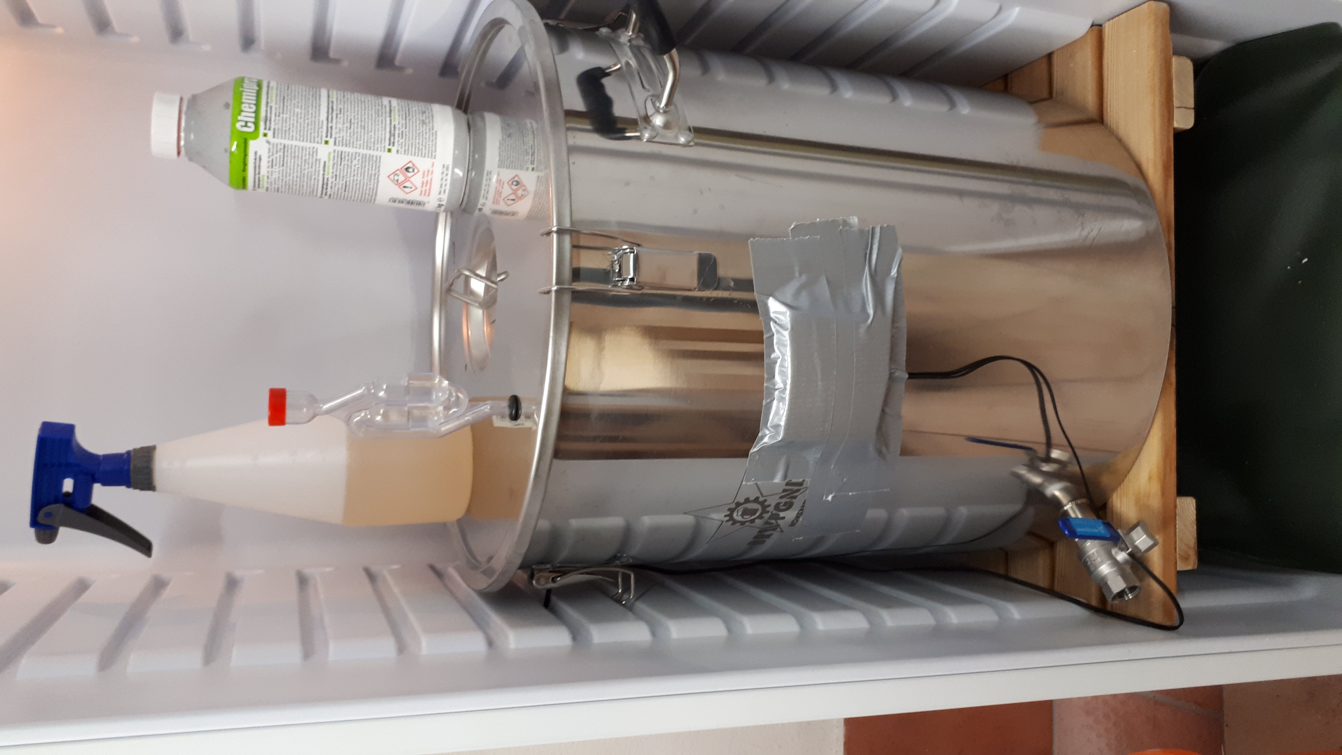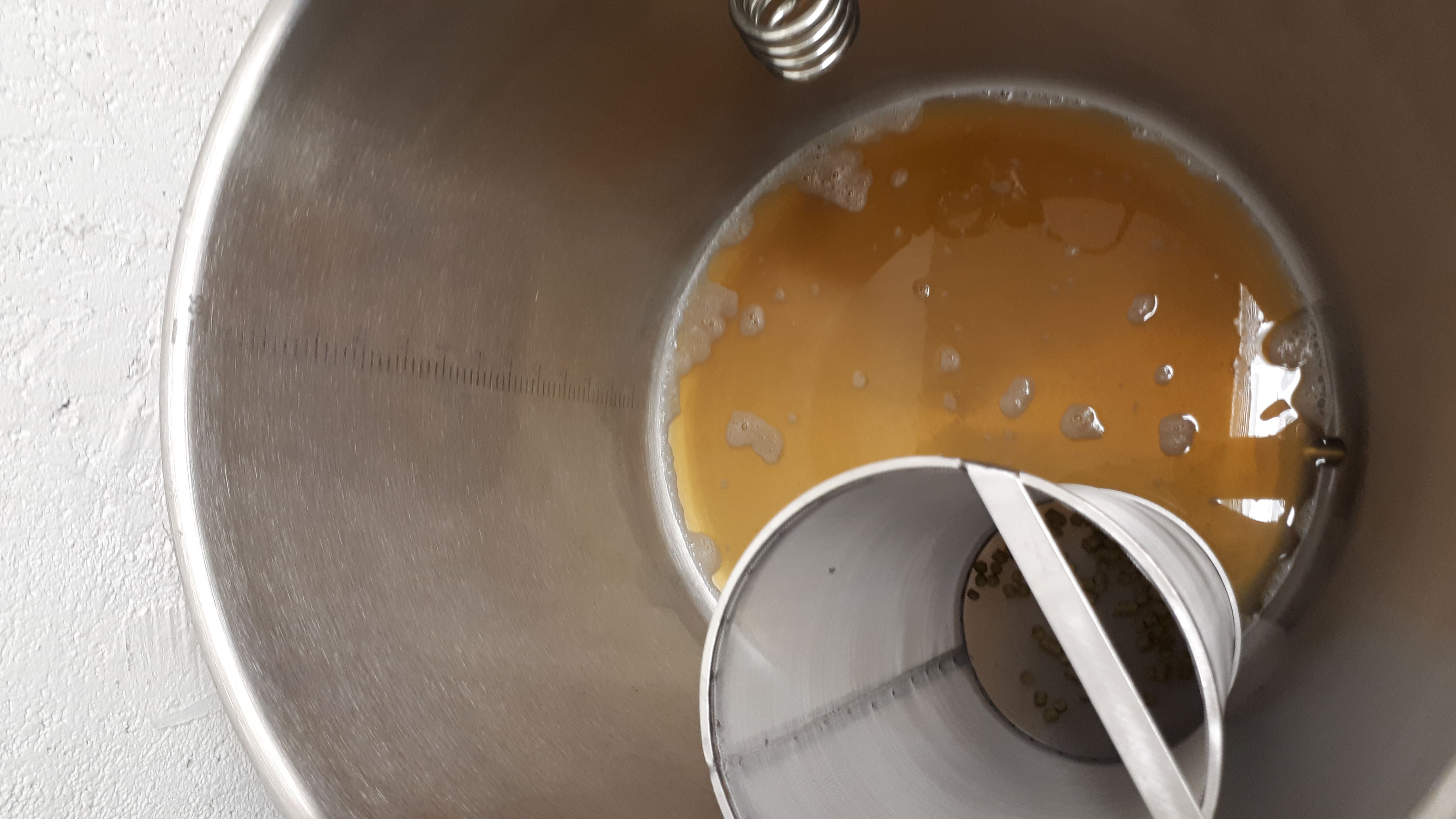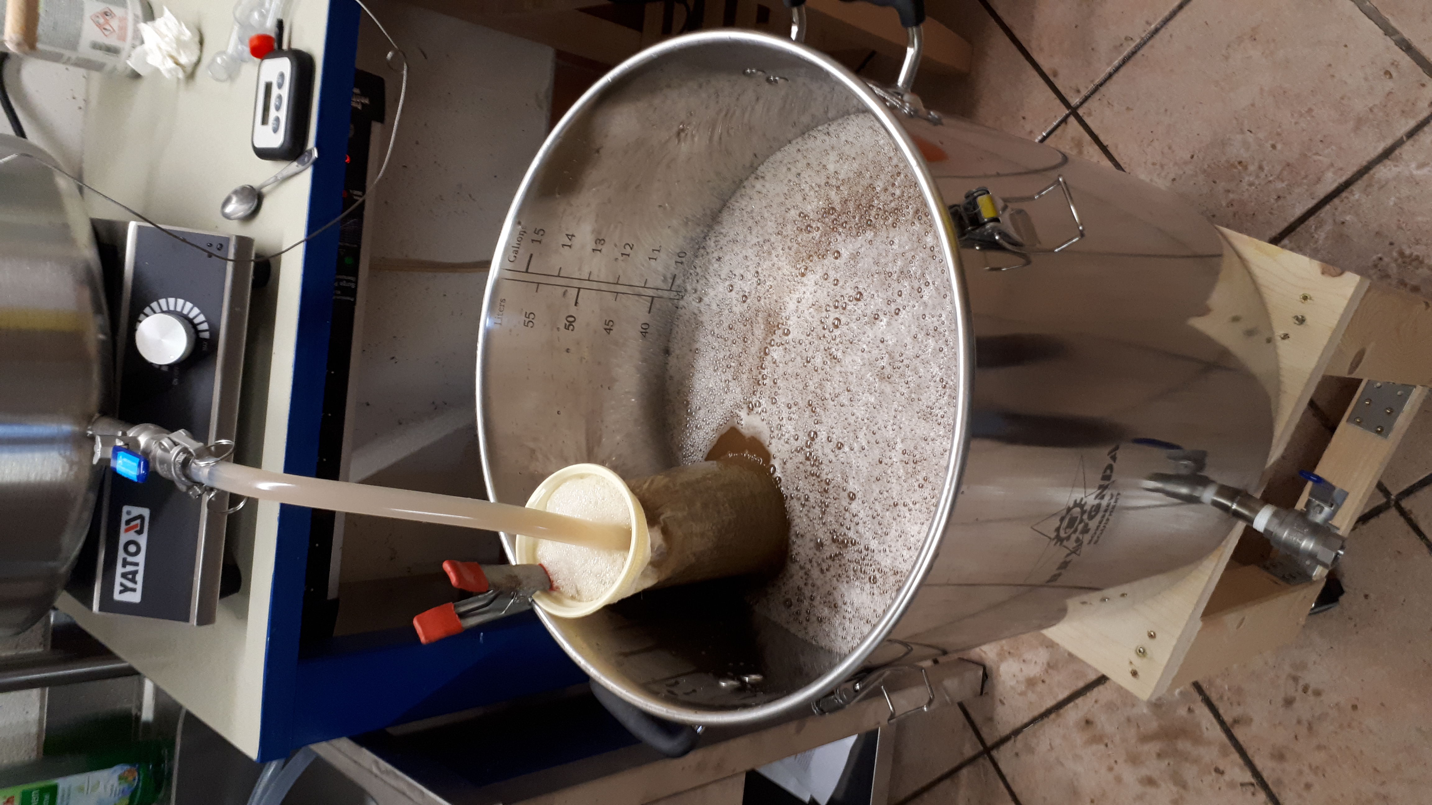 Ich habe dann weiter gekühlt auf ca. 20°C, nebenbei 3 Päckchen Trockenhefe nach Anleitung rehydriert und ohne Whirlpool in den Gärbehälter abgelassen. Gefiltert wurde nur mit einem Monofilamentfilter, der gan klar an seine Kapazitätsgrenze gekommen ist.
