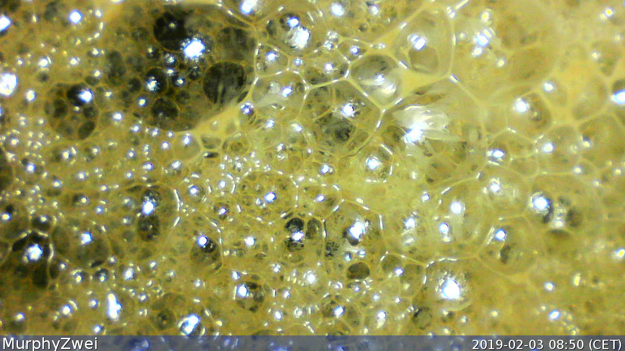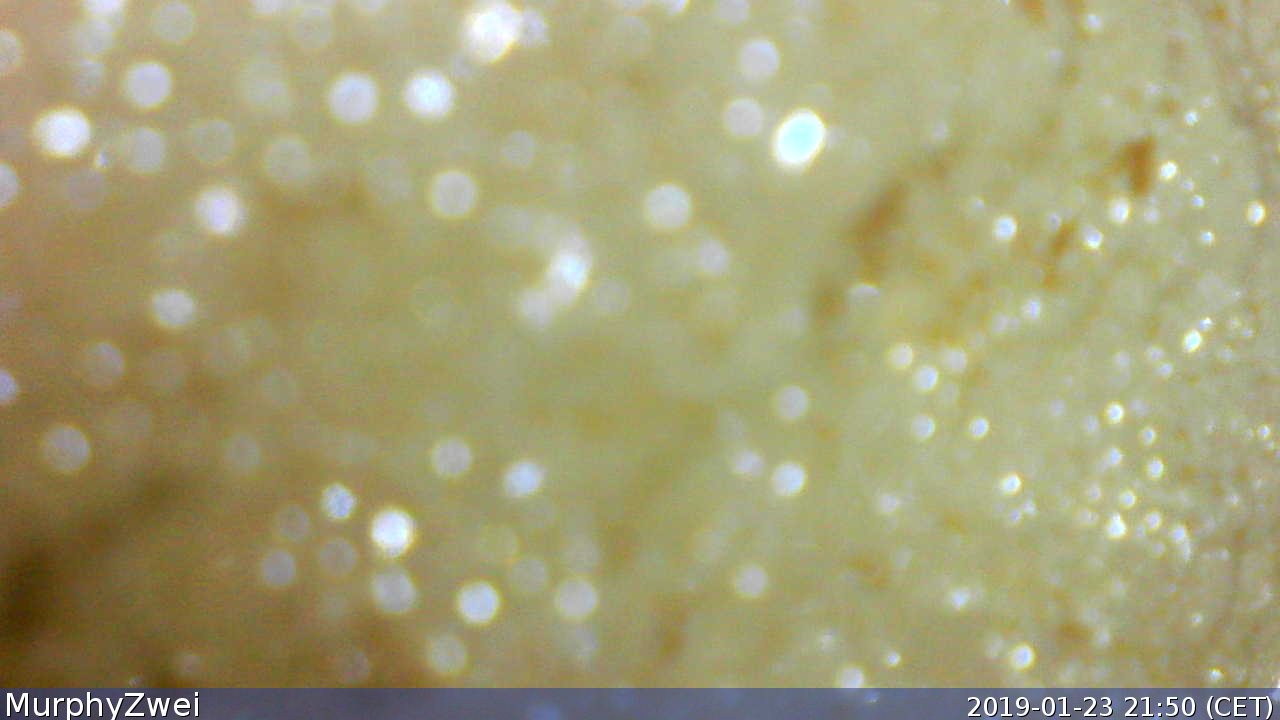 Es gibt für vergleichsweise wenig Geld USB "Endoskop"-Kameras im Netz zu bestellen. Gedacht sind die vornehmlich um in schwer zugängliche technische Geräte, Abflüsse und so weiter hineinzuschauen. In den Angeboten ist meist der Betrieb am Handy mit App zu sehen, geklappt hat es bei mir auch mit dem Raspberry Pi und den dortigen Standardanwendungen. Dem Einsatzzweck entsprechend ist das Bild nur im Bereich ca. zwei bis zehn Zentimeter vor der Linse scharf und zeigt einen recht engen Bildausschnitt. So eng, dass man größere Blasen zum Ende der Gärung schon mal vor Schreck für eines der Kahmhefenbilder hier halten kann - war zum Glück Fehlalarm